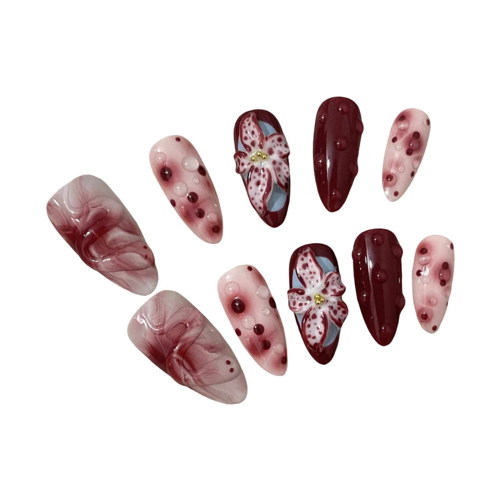10pcs 3D Spotted Flowers Almond Handmade Press On Nails With Wine Red Smudging Design False Nails Transparent Small Snake Decor