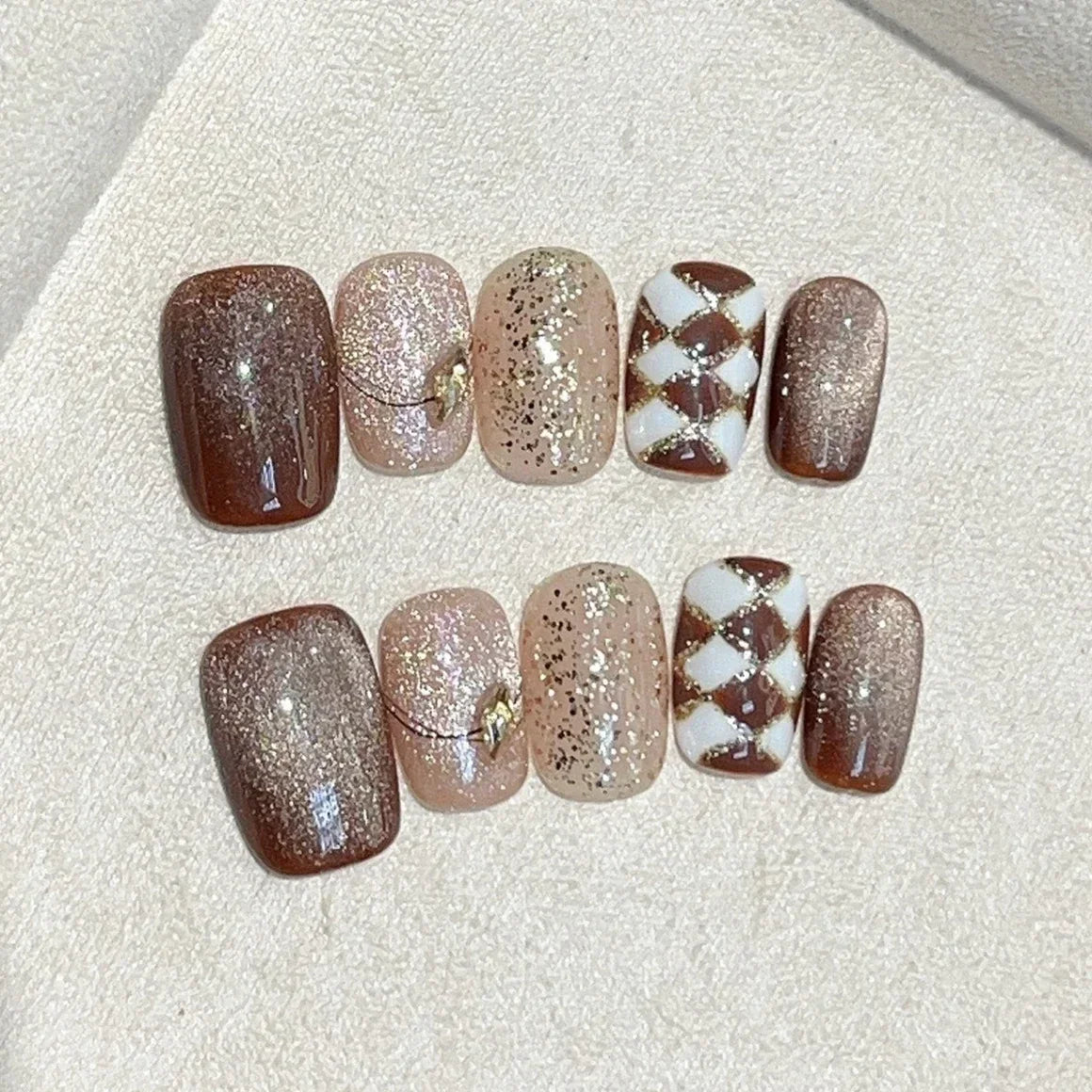 10Pcs Brown Handmade Press on Nails Full Cover Shiny Cat Eye Autumn-winter French Short Ballerina False Nails Wearable Manicure