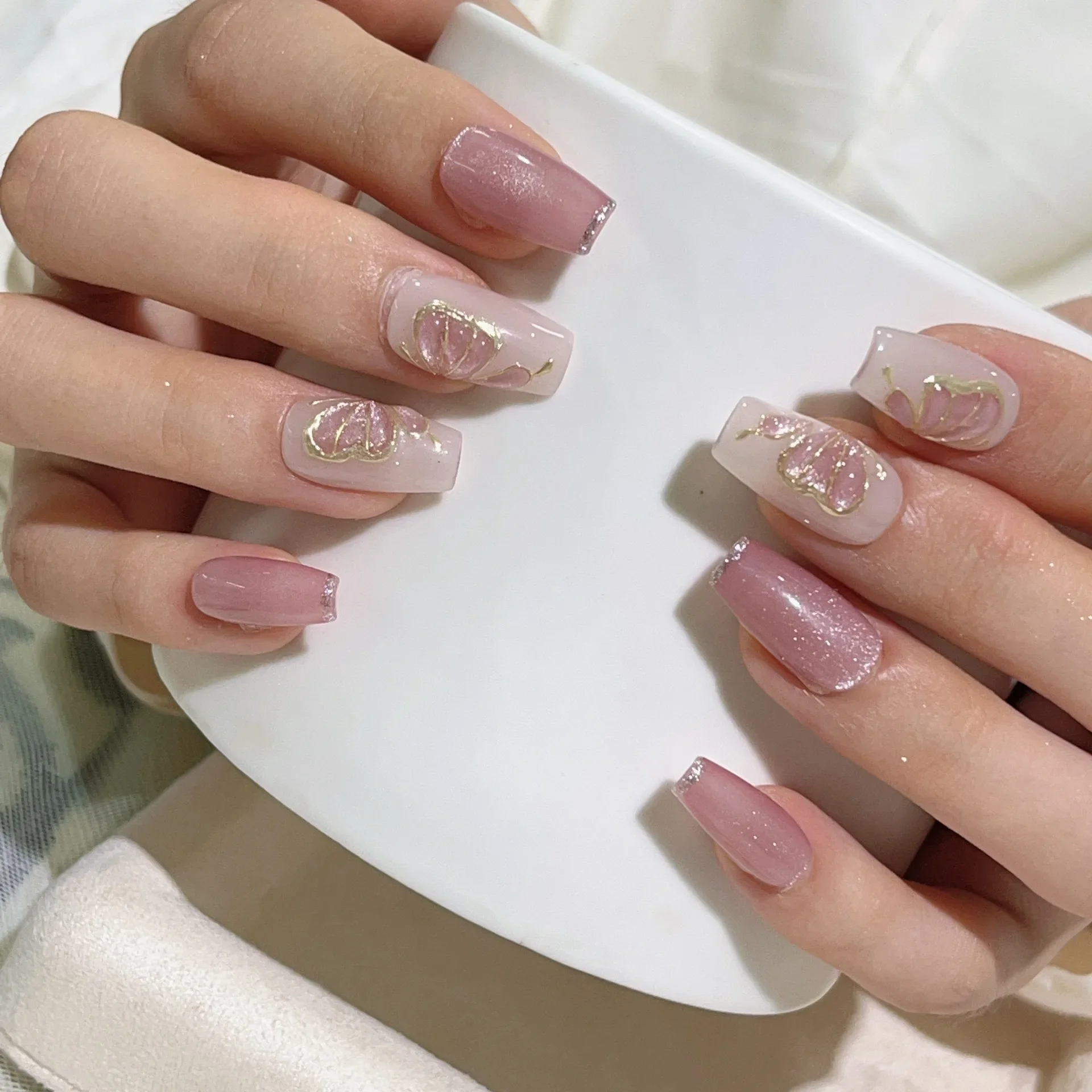 10Pcs Cute Pink Handmade Press on Nails Full Cover Butterfly Flower Cat Eye Design French Ballet Manicure False Nails Nail Tips