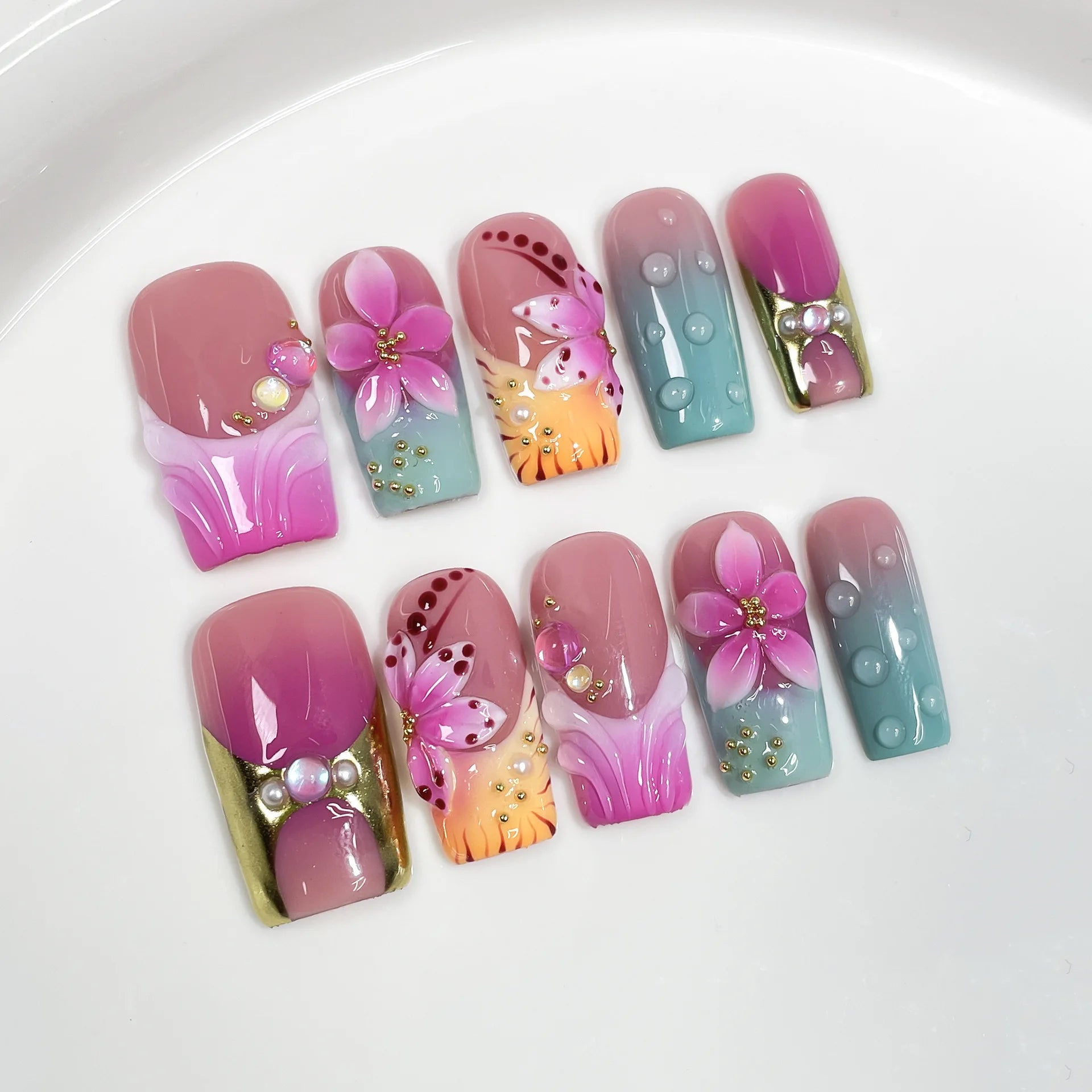 10pcs French Gradient Handmade Fake Nails Flower Rhinestone Design Spicy Girl Mid-length Square False Nails Tips Press on Nails