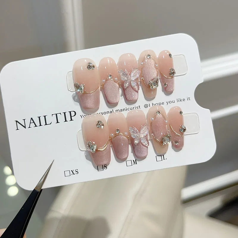 10Pcs Glitter Handmade Press on Nails Full Cover Cat Eye Butterfly Design Pearl Rhinestone French Ballet Artificial False Nails