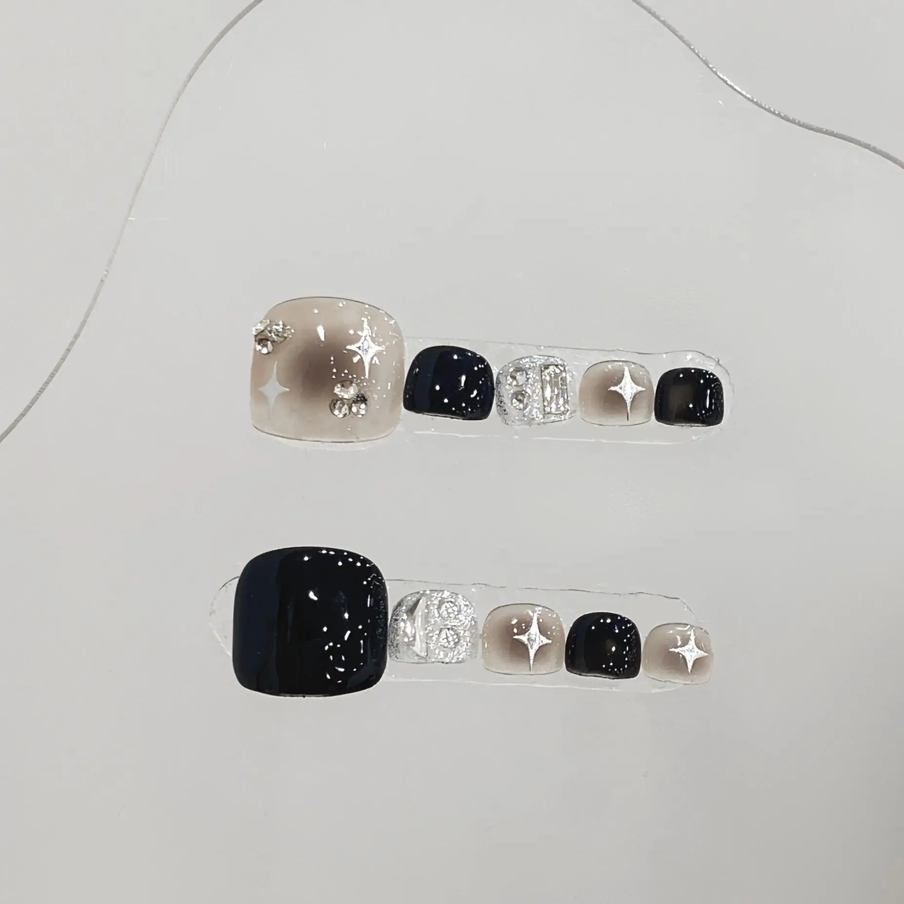 10pcs Glossy Square Fake Toenails Handmade Black Star Toe Nail Press Ons With Glitter Shiny Diamond Design Cool False Footnails