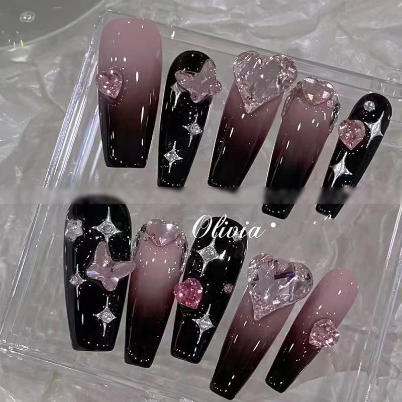10pcs handmade dark sweet y2k fake nails with glue pink star press on nails long shiny hot girl designs false nails with tools