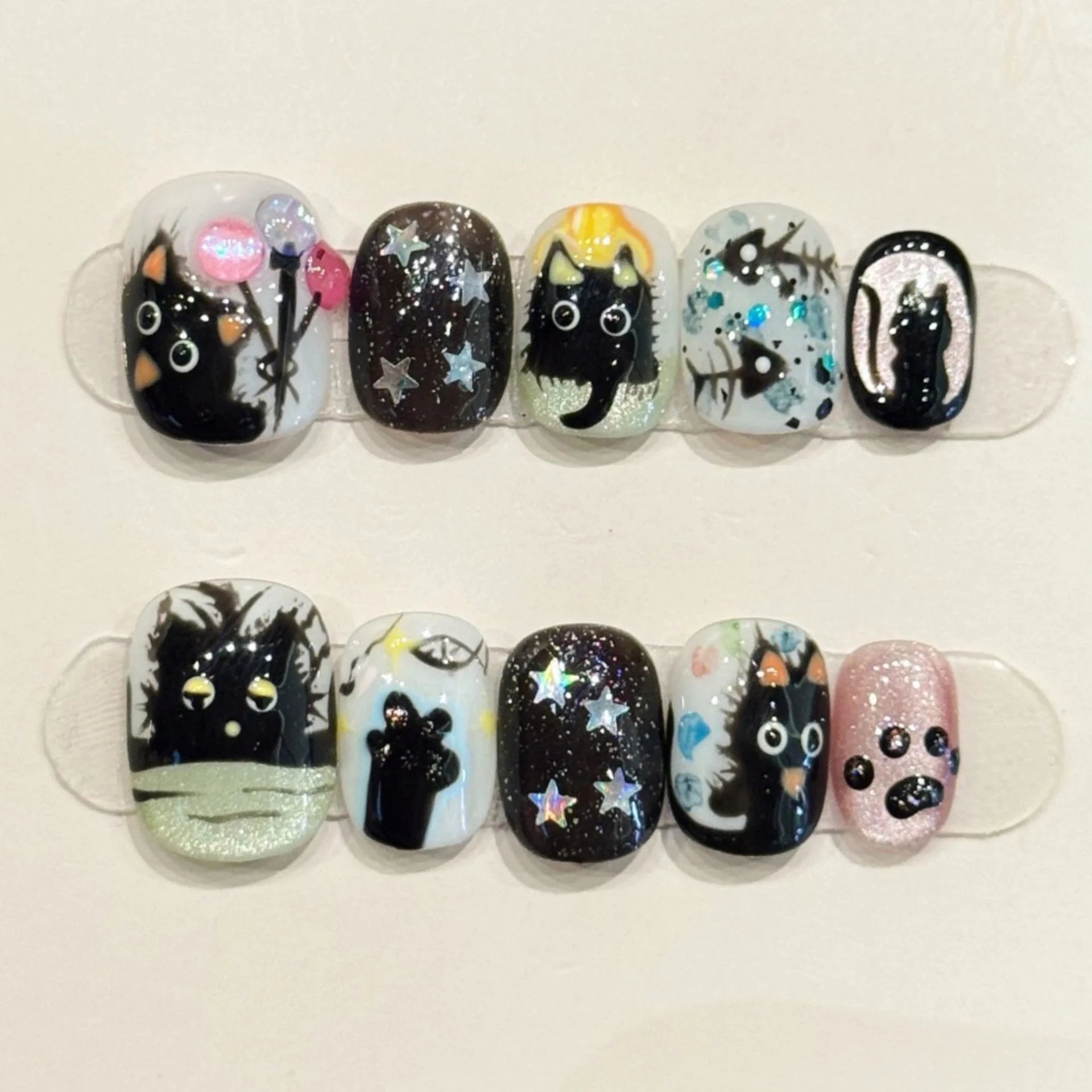 10pcs Handmade False Nails Art Wearable Cartoon Cute Cat Pattern Short Square Press on Nails Tips Bow Design Black Fake Nail Set