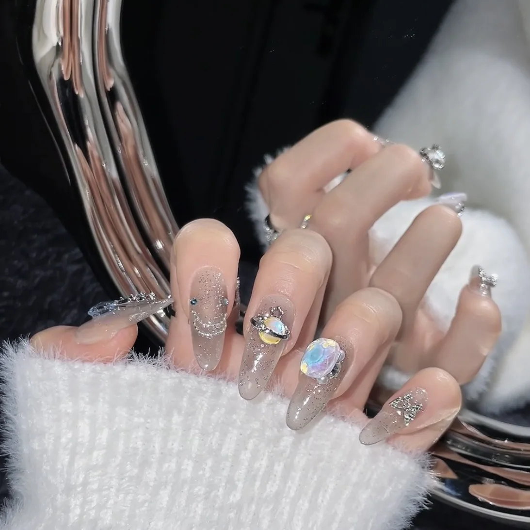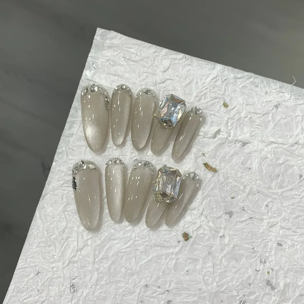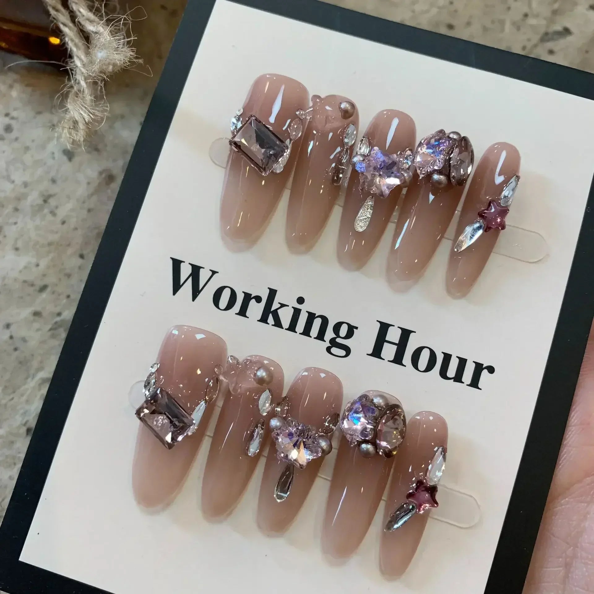 10Pcs Handmade Long False Nails with Glue Press On Nails Full Cover Glitter Almond Heart Rhinestone Manicure Wearable Nail Tips