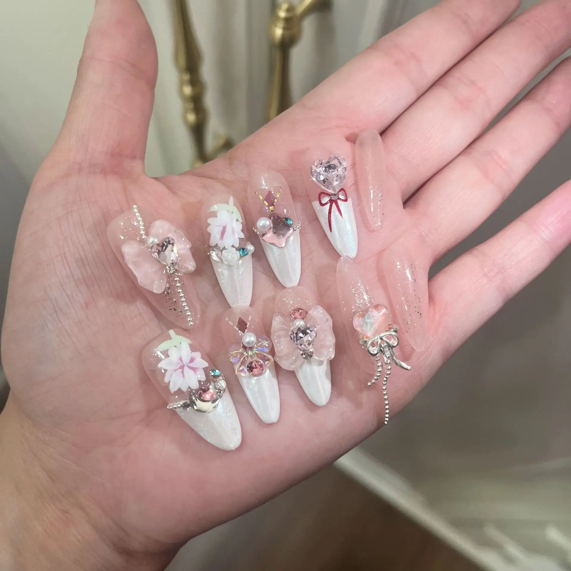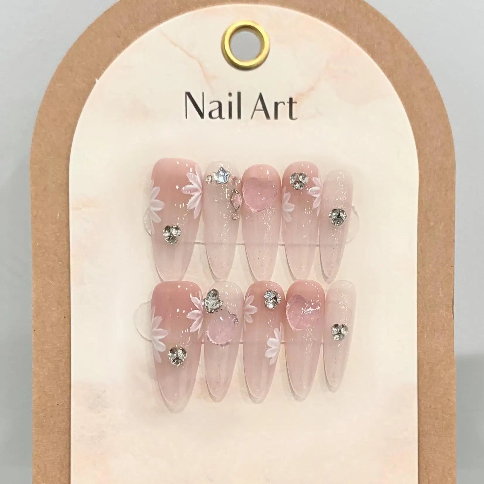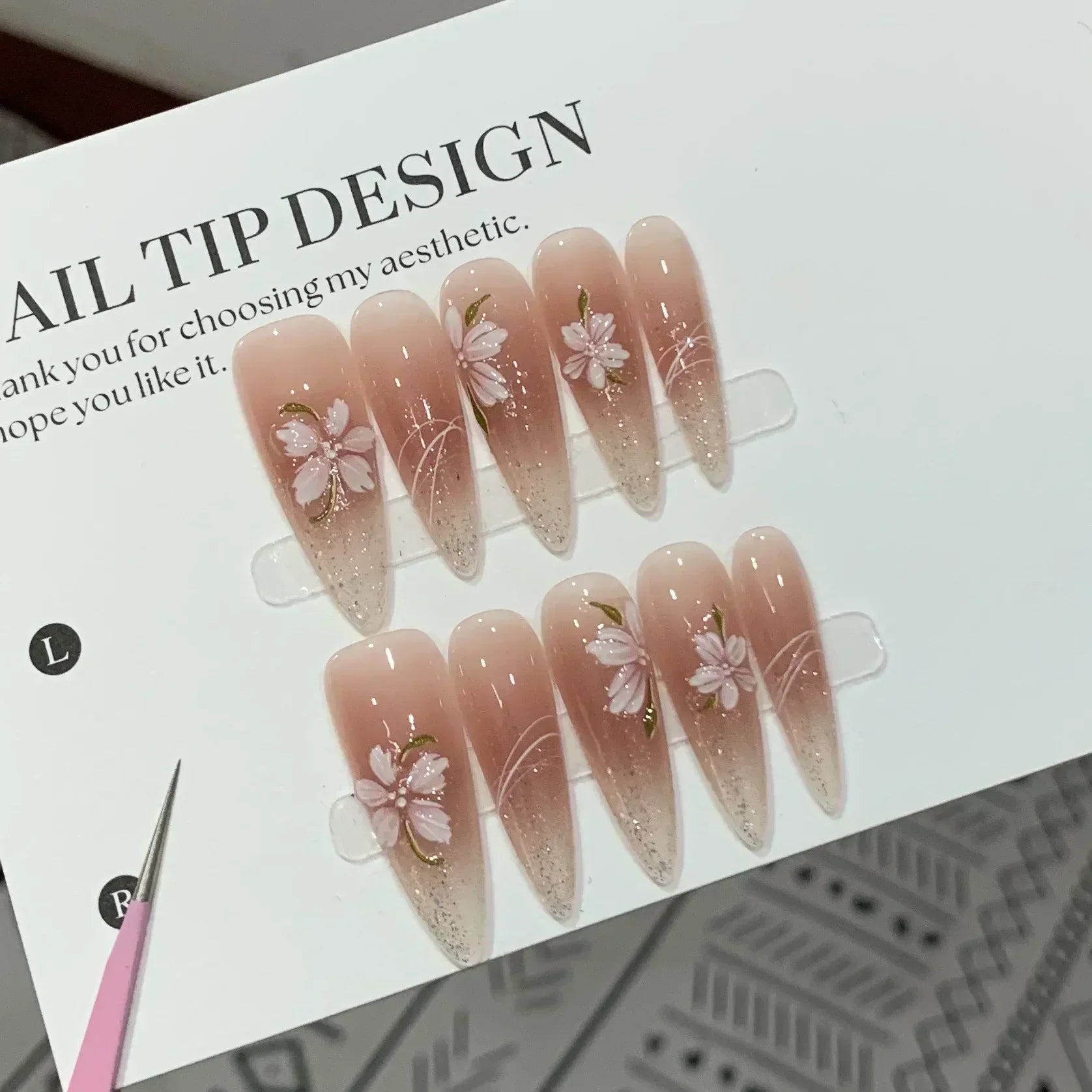 10Pcs Handmade Nails Set Press on Long Almond False Nail with Rhinestone Pink Camellia Design Reusable Full Cover Fake Nail Tips