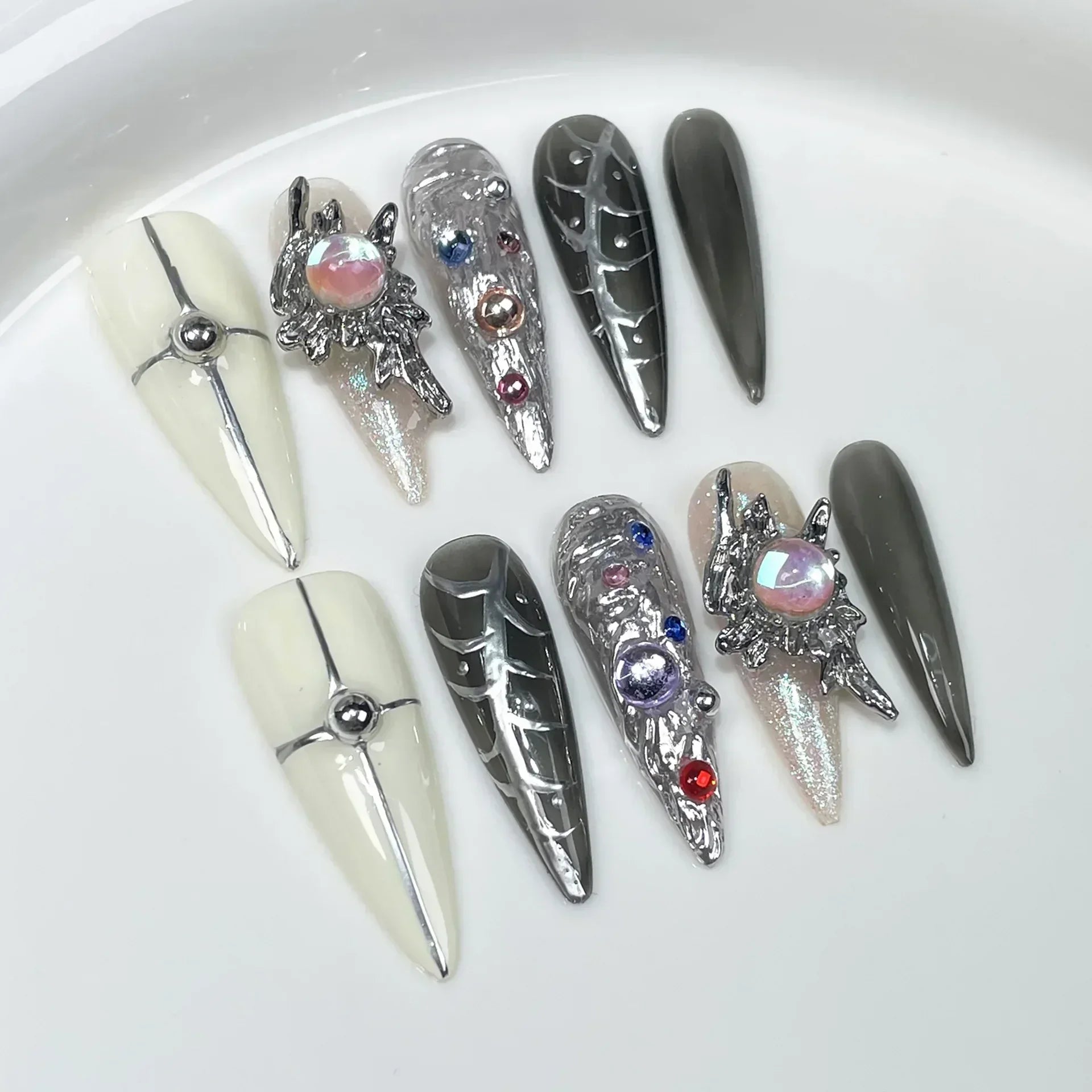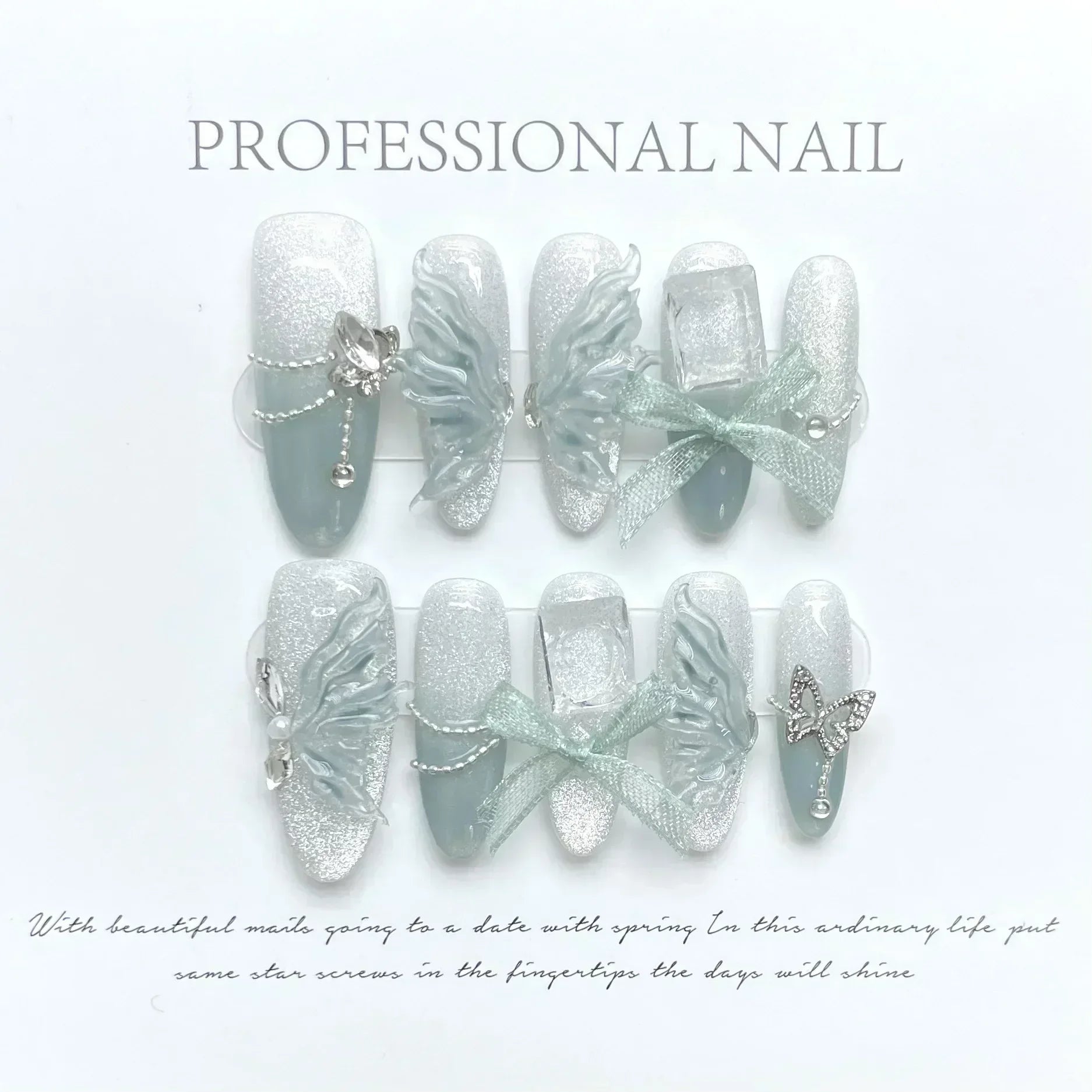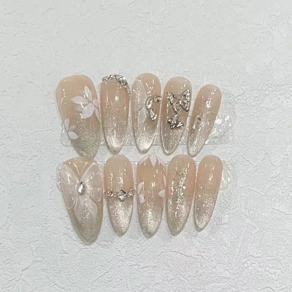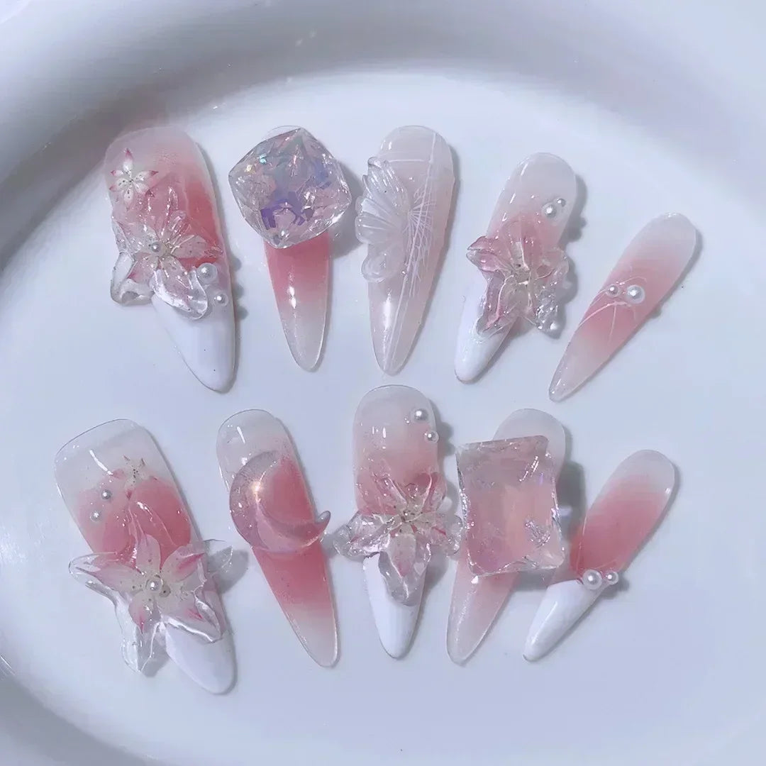 10Pcs Handmade Nails Set Press on Long Almond False Nail with Rhinestone Pink Camellia Design Reusable Full Cover Fake Nail Tips