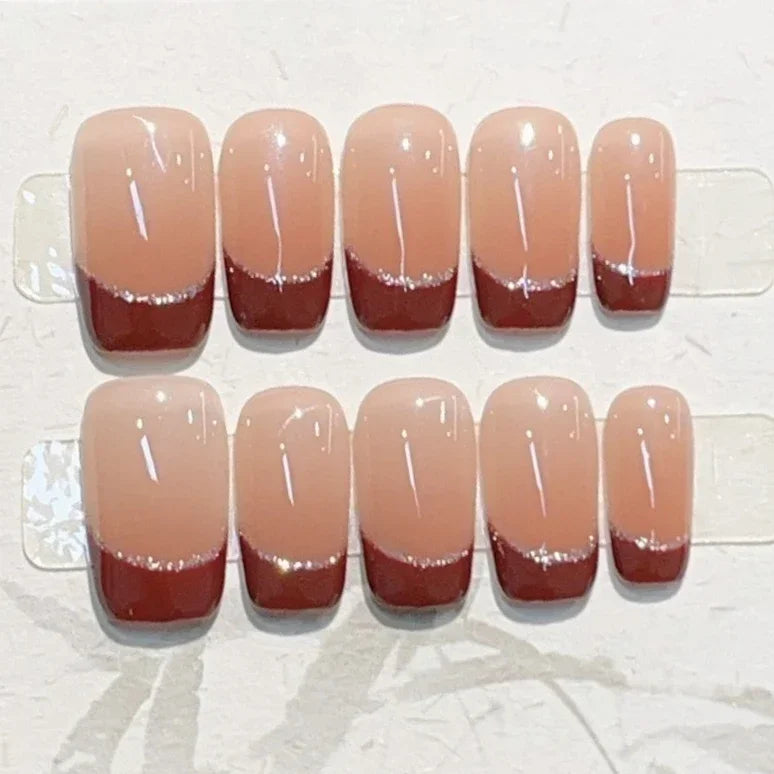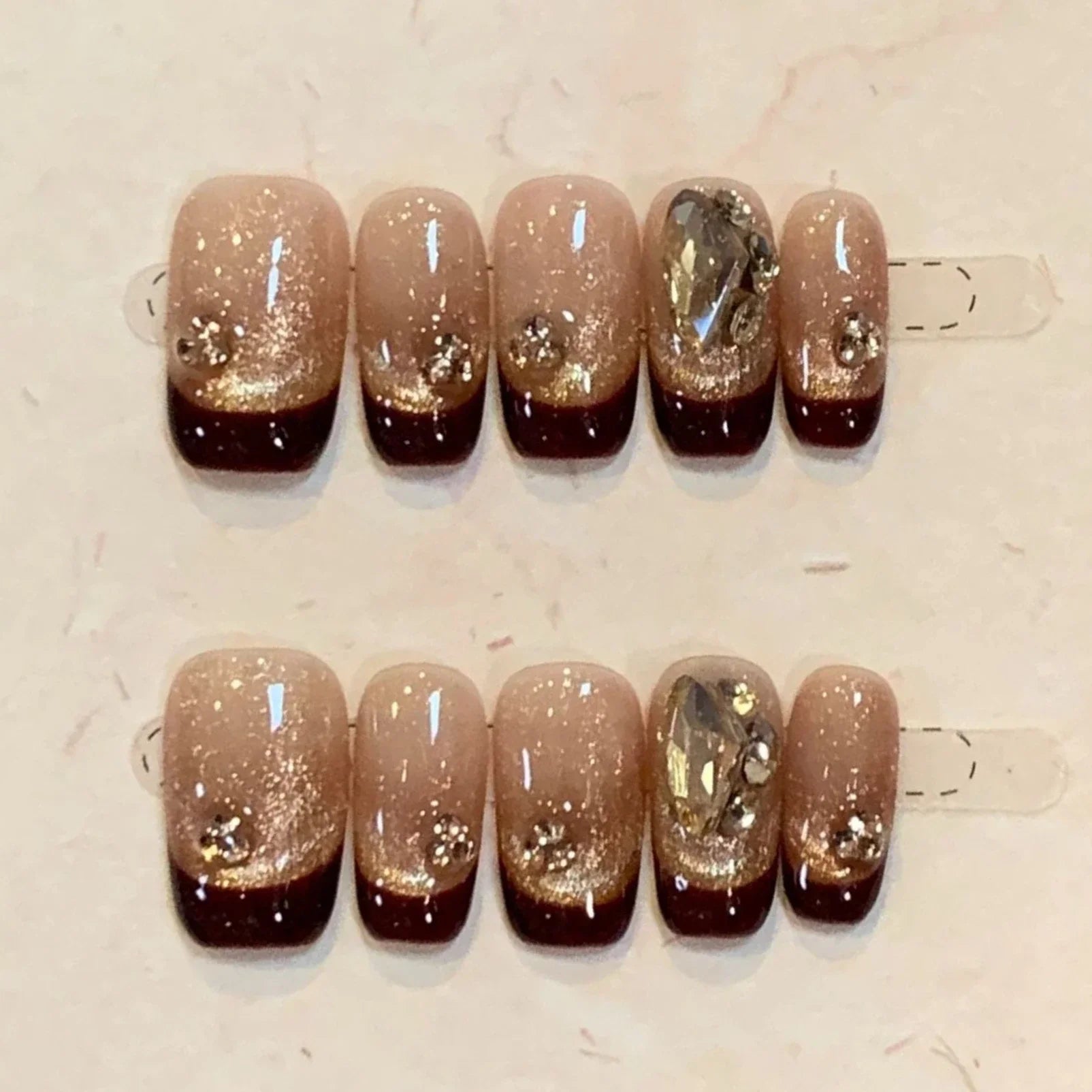 10Pcs Handmade Press on Nails Full Cover Brown Glitter Cat Eye Rhinestone Design French Short Ballet Fake Nail Wearable Manicure