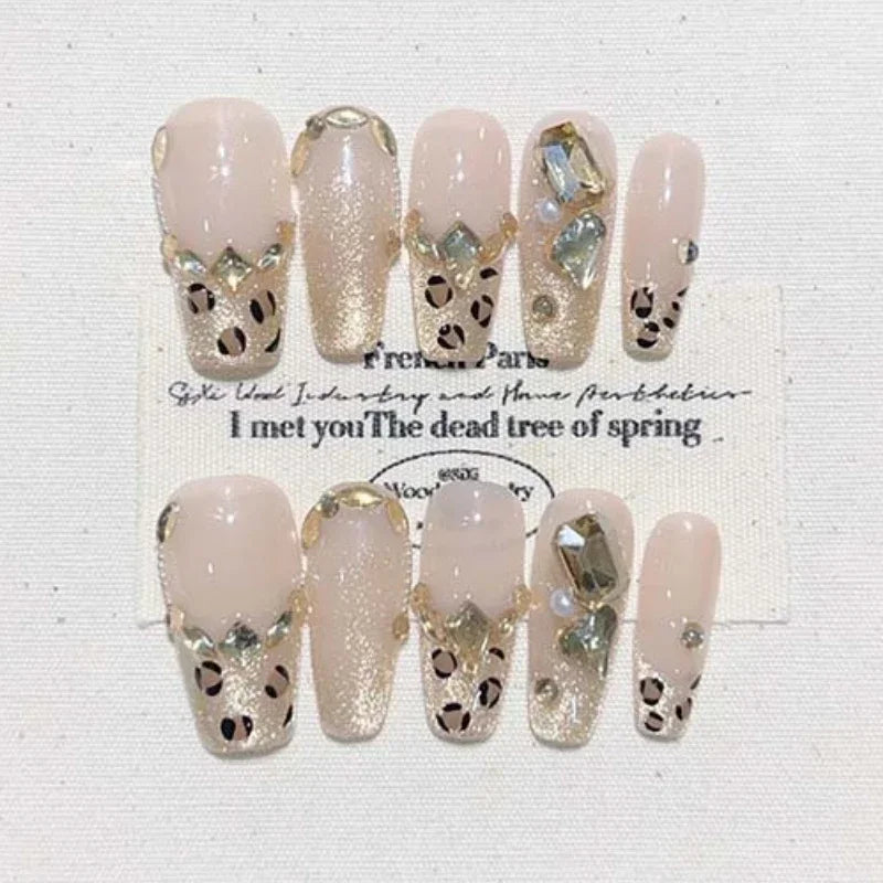 10Pcs Handmade Press on Nails Full Cover Cat Eye Design False Nails Leopard Autumn Pearl Ballet Rhinestone Wearable Manicure