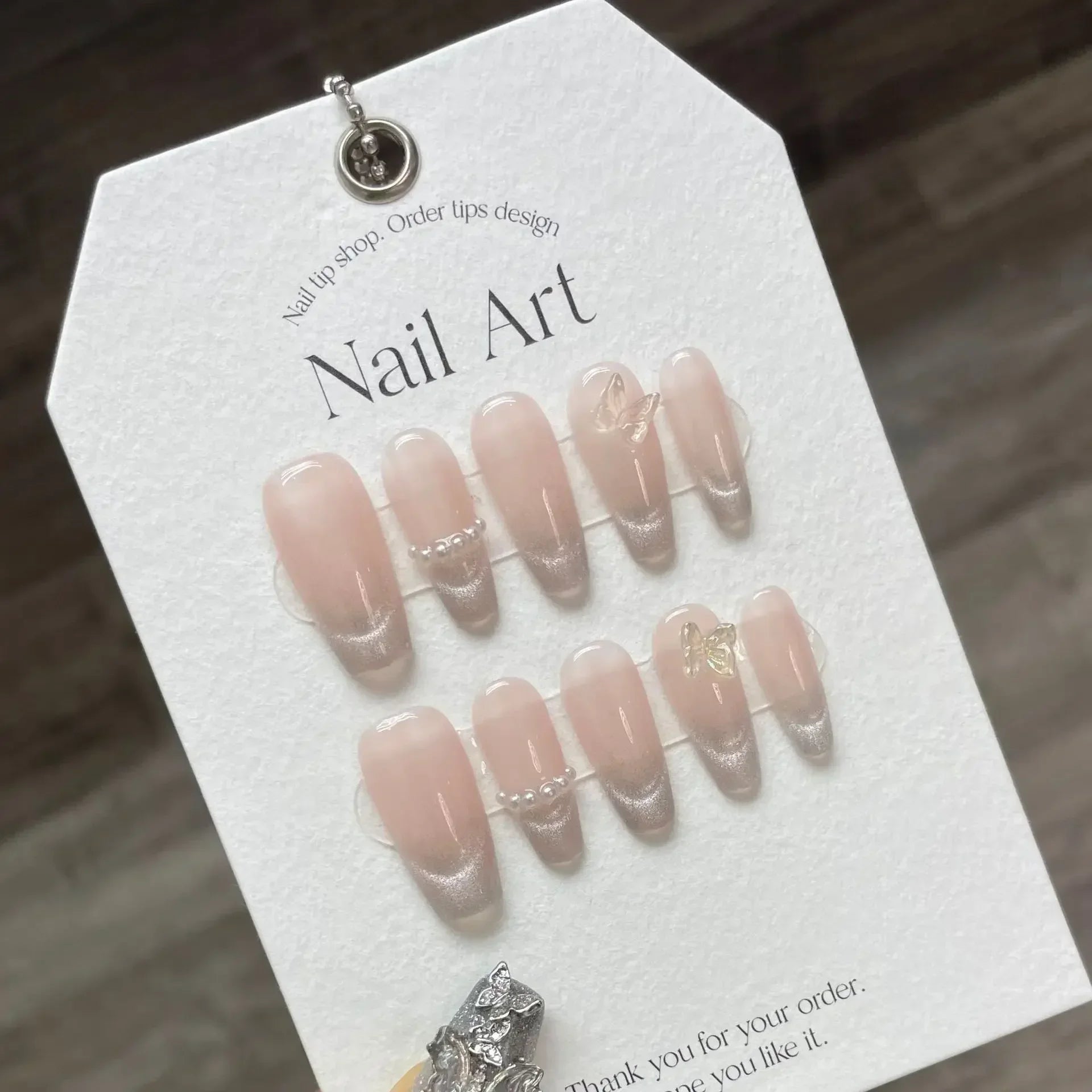 10Pcs Handmade Press on Nails Full Cover Elegant Design French Ballerina Cute Pink False Nails Wearable Manicure Nail Tips Art