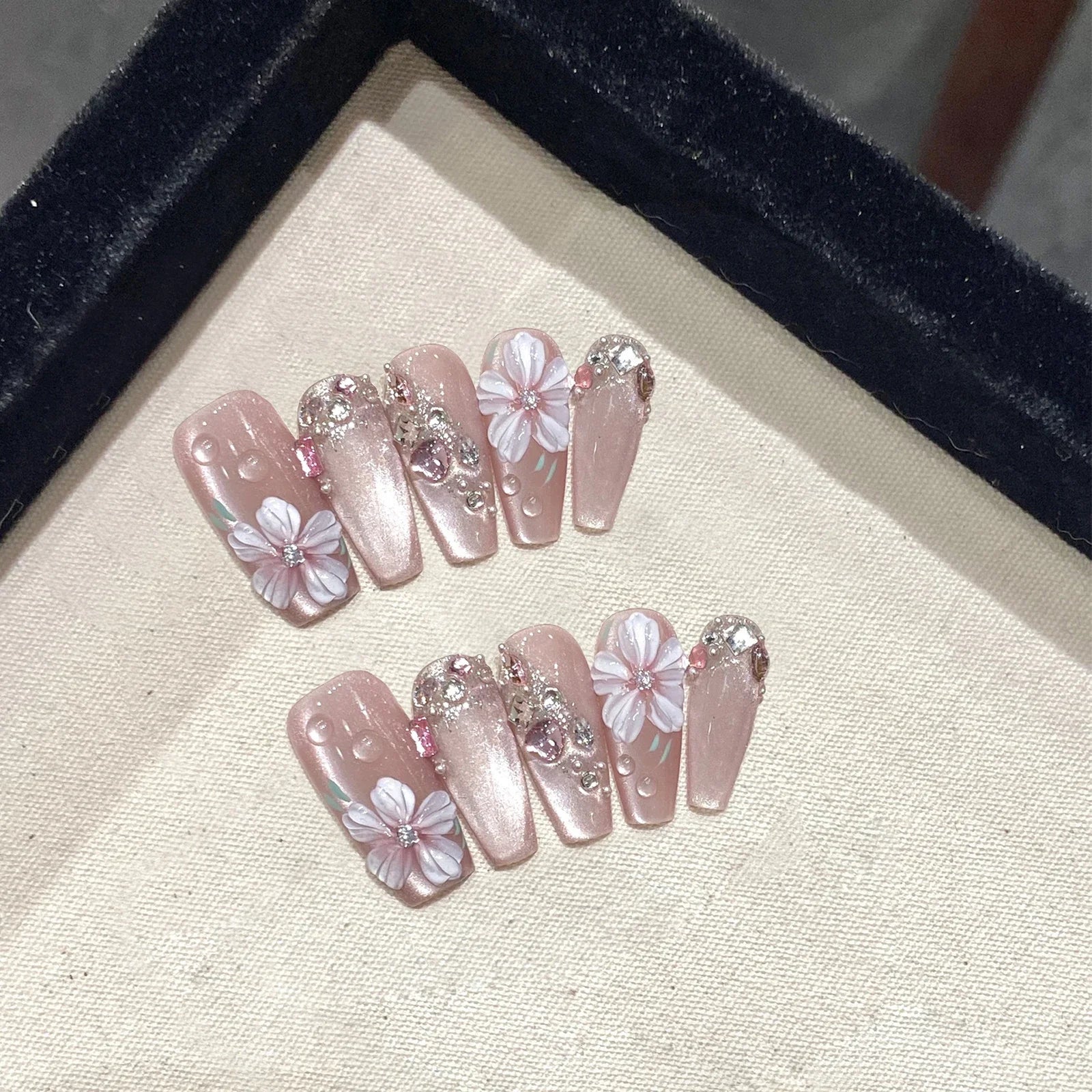 10Pcs Handmade Press on Nails Full Cover Glitter Hand-painted 3D Flower Rhinestone French Fake Nail Artificial Wearable Manicure