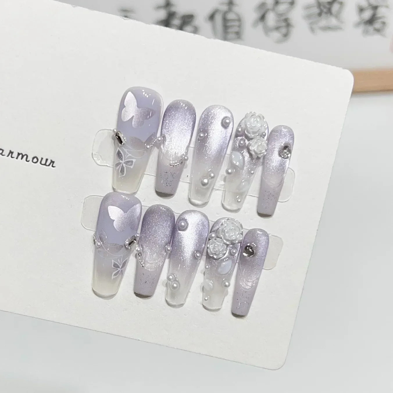 10Pcs Handmade Press on Nails Full Cover Long Coffin 3D Flowers Butterfly False Nails Shiny French Ballerina Wearable Manicure