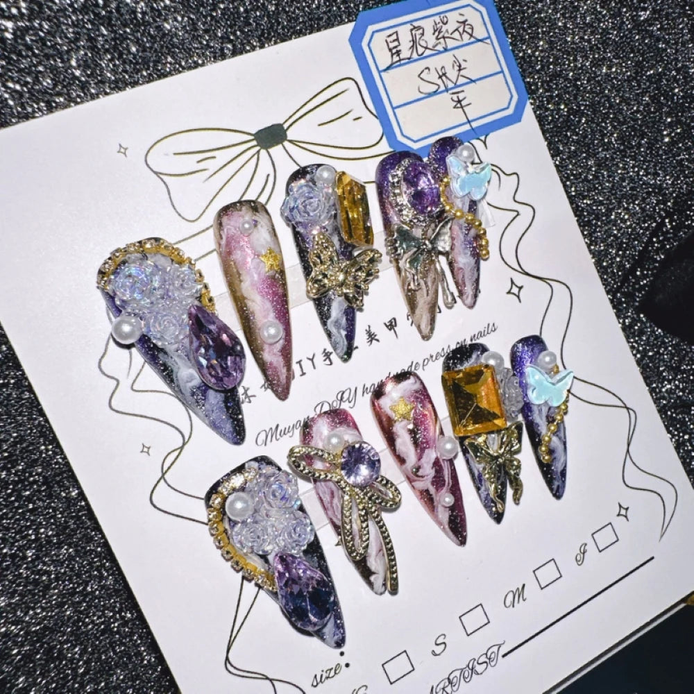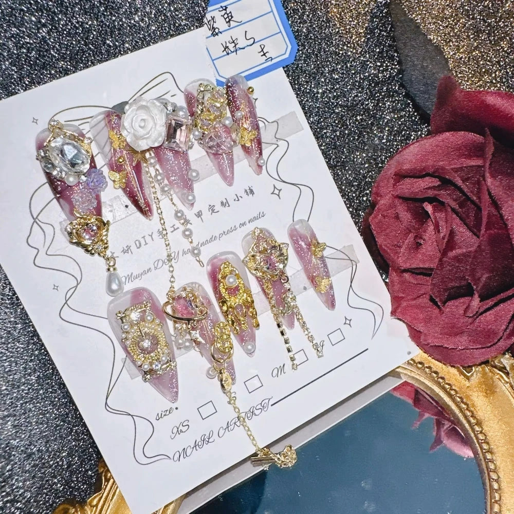 10Pcs High Quality Handmade Press on Nails Red Gold New Year's Hot Selling Diamond Jewelry Luxury Flash Niche Style Spicy Girl