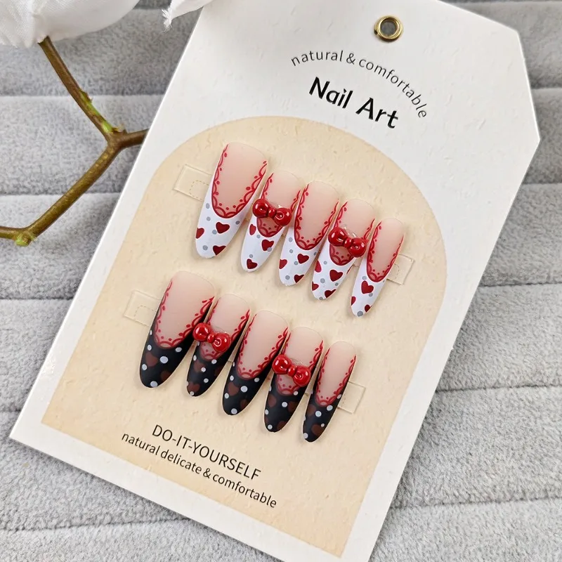 10pcs New Year Handmade Long French Oval Press on Nails with 3D Red Bowknot Lace Design False Nails Wearable Acrylic Fake Nails