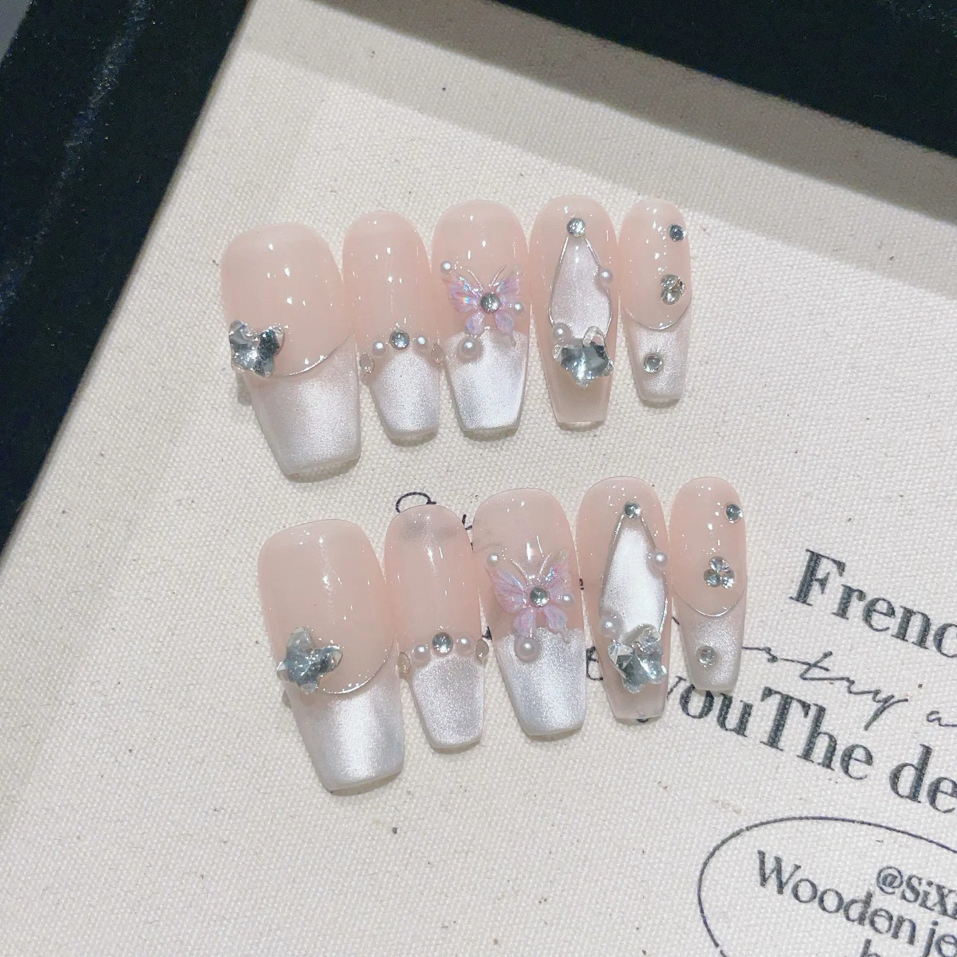 10Pcs Pink Handmade Press on Nails Butterfly Rhinestone Design Full Cover False Nails Cat Eye French Ballerina Wearable Manicure