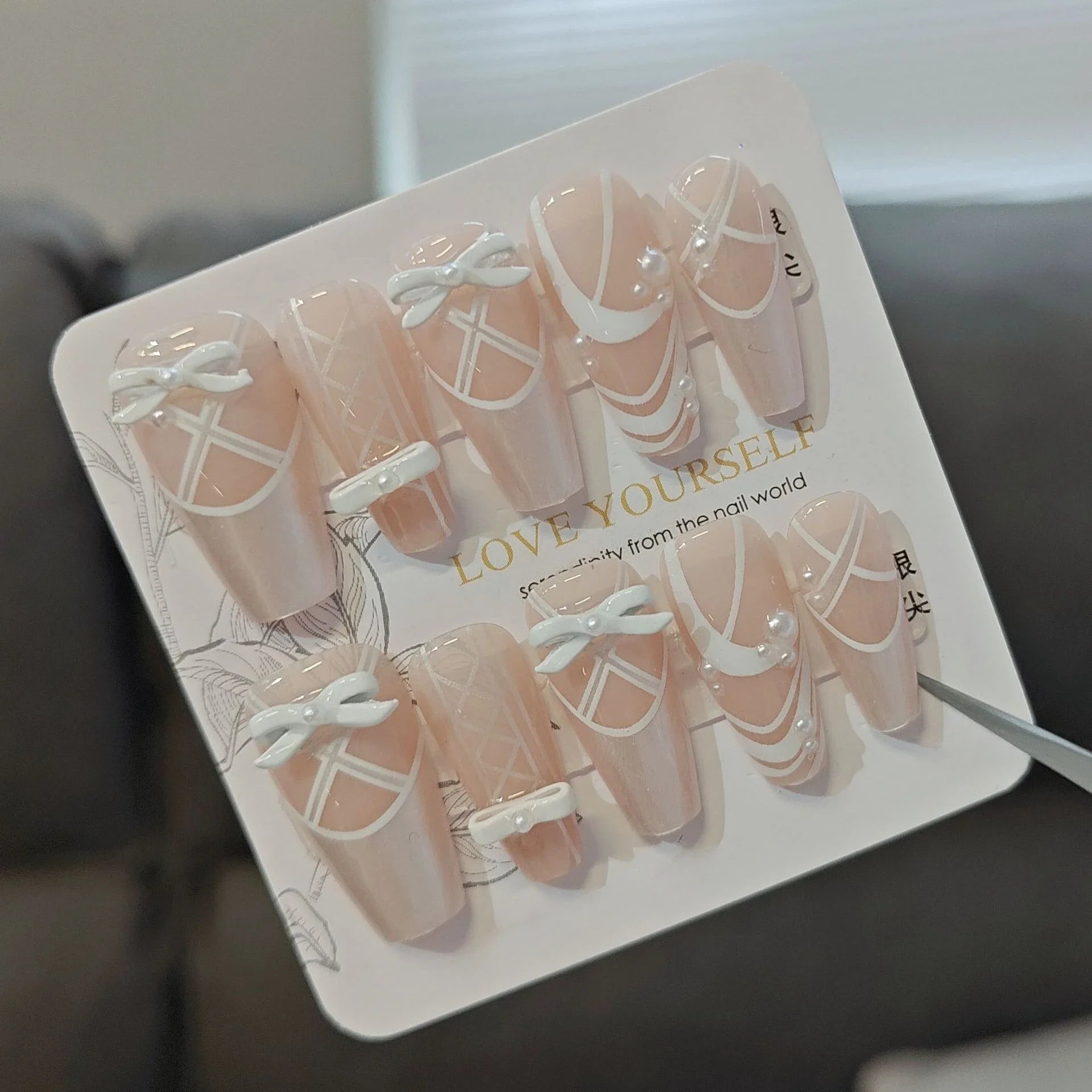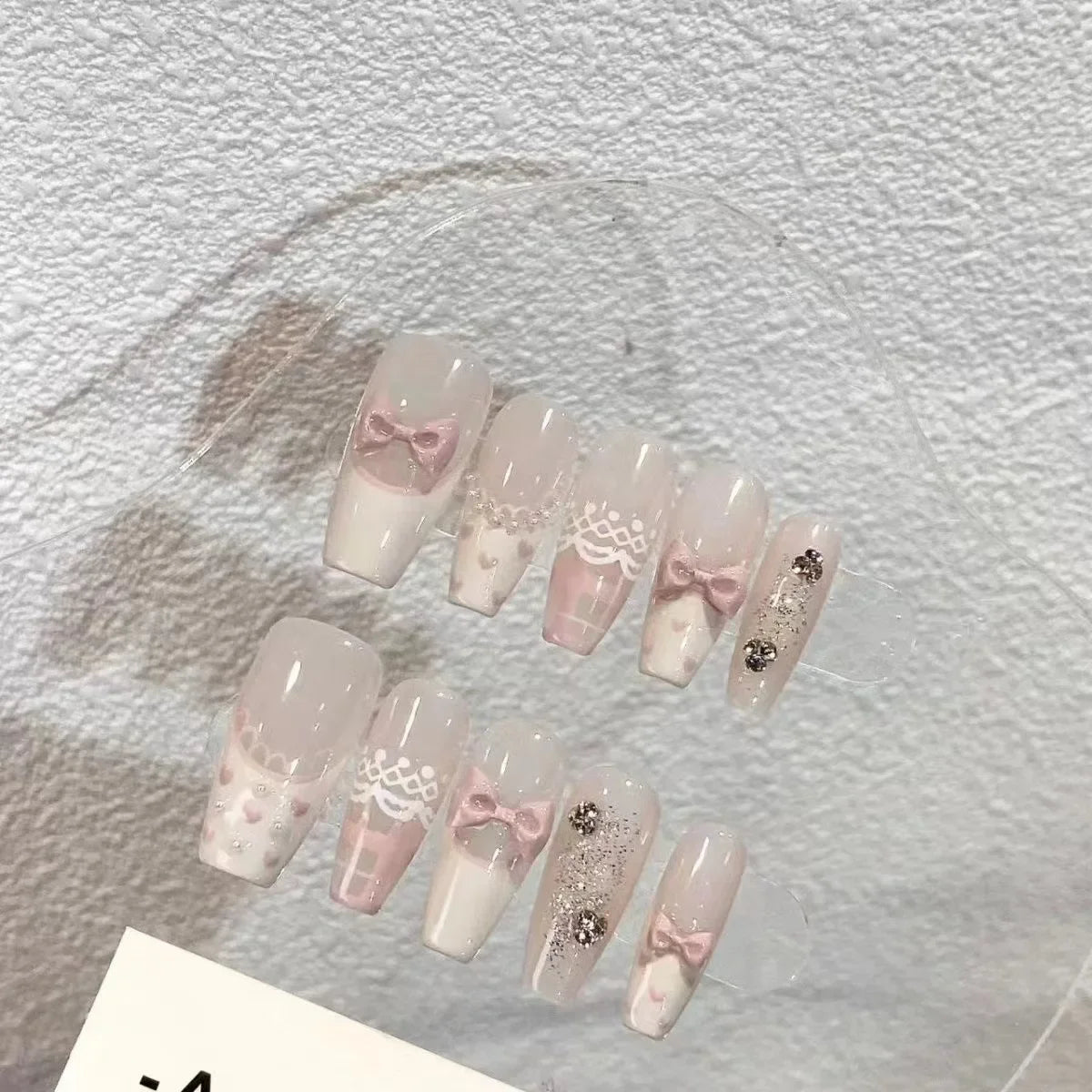 10Pcs Pink Handmade Press on Nails Full Cover Pearl Light Cat Eye Design French Sweet Bow Tiw False Nail Tips Wearable Manicure