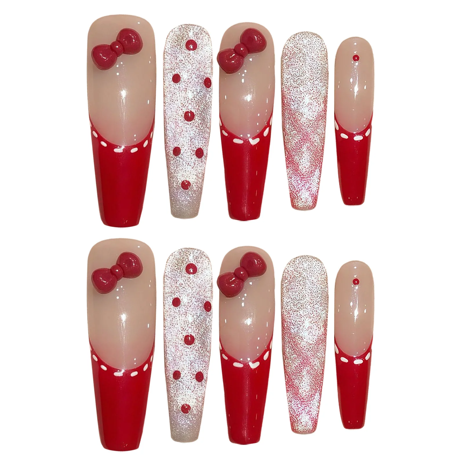 Stylish Variety: Our set includes 10pcs of long coffin bowknot press on nails featuring glitter and dots designs, perfect for adding a touch of glamour to any outfit or occasion.
