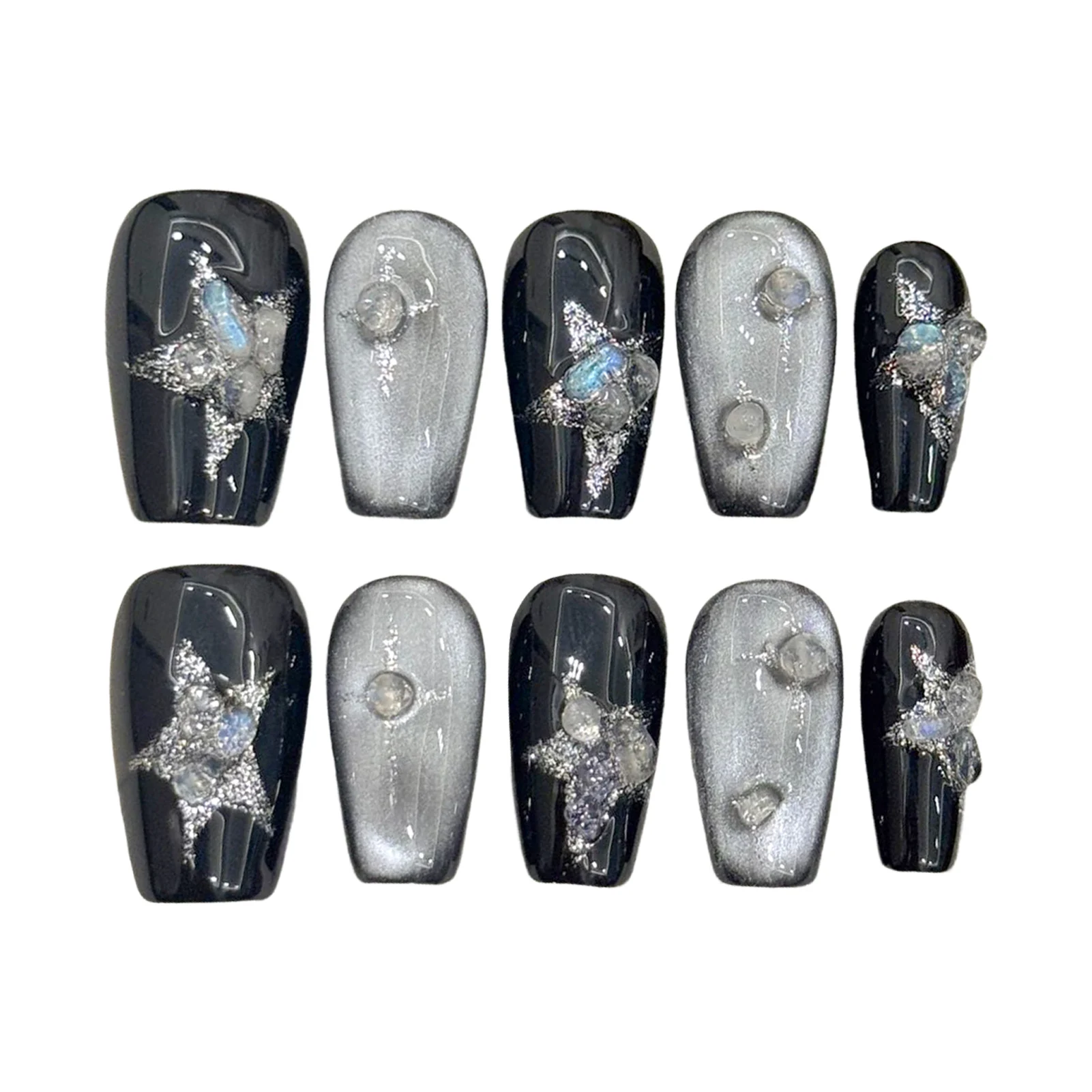 Unique Styles: Featuring shiny star fake nails with cat eye effects and dark glossy glitter press on nails, these designs allow for creative expression, making them ideal for diy nail art enthusiasts and professionals alike.