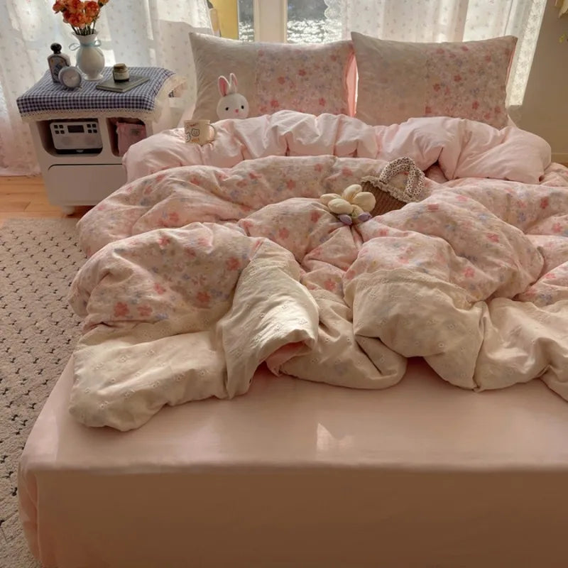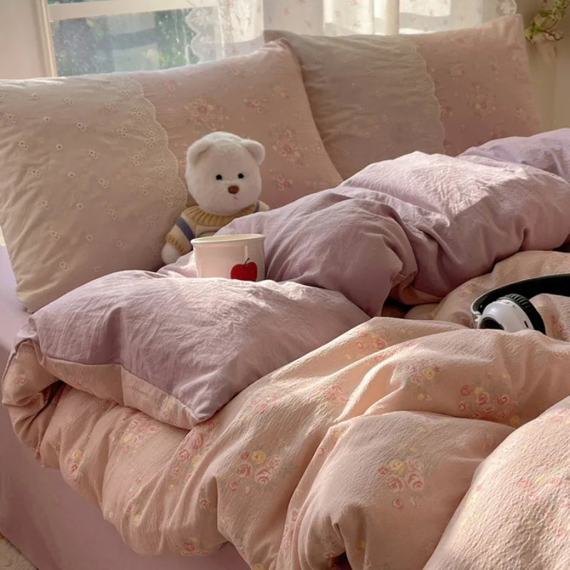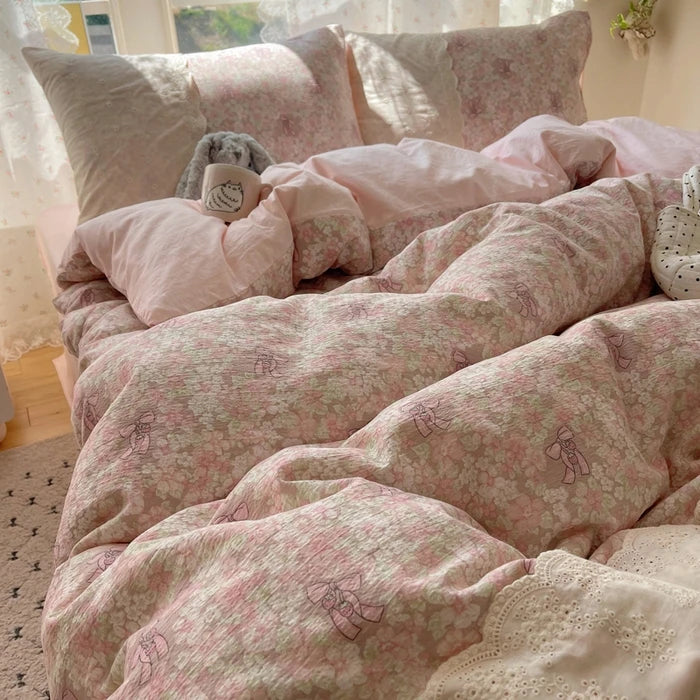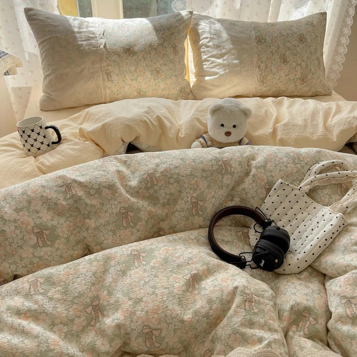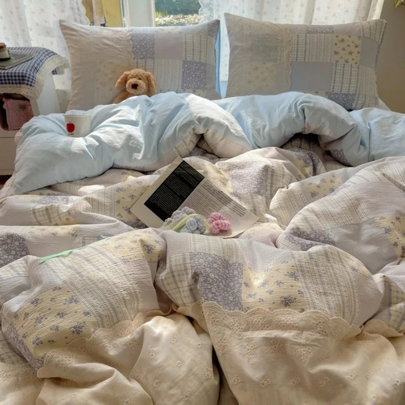 2025 new small floral cloud wrinkle double yarn bed four-piece set princess lace quilt cover three-piece bed sheet set