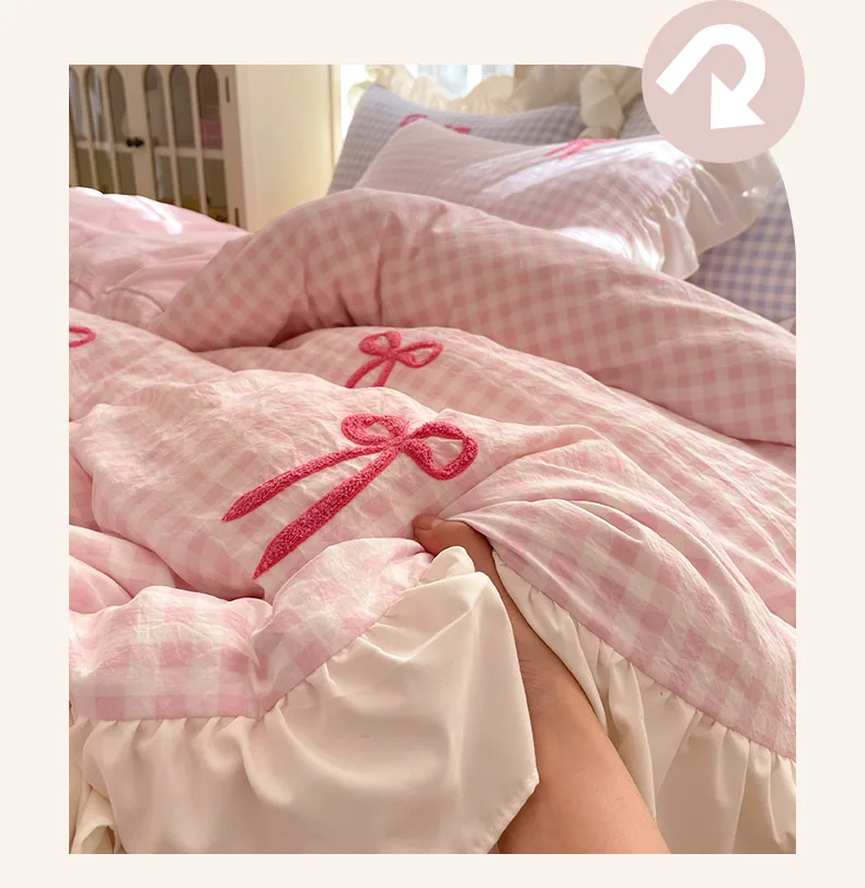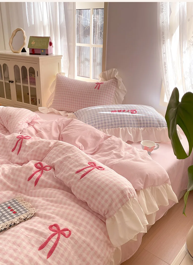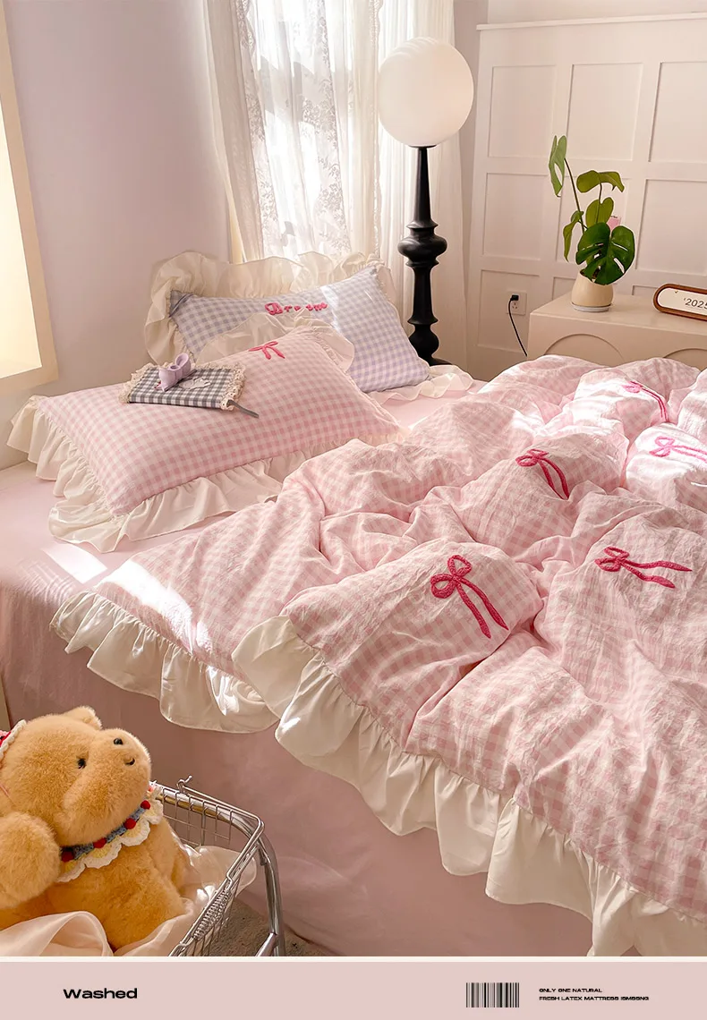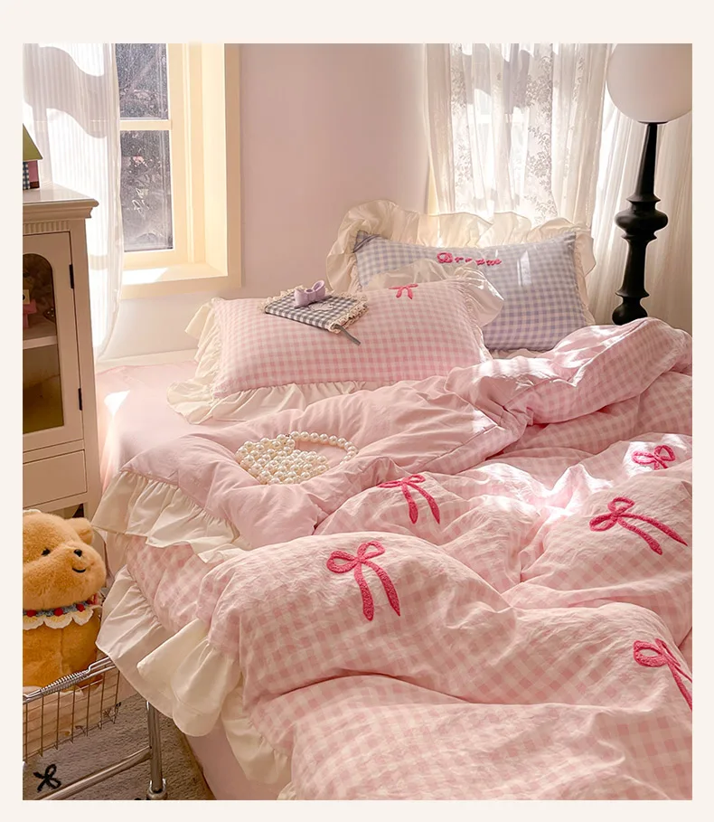 2025 spring and summer new Korean lace bow four-piece princess style lace washed cotton girl heart pink