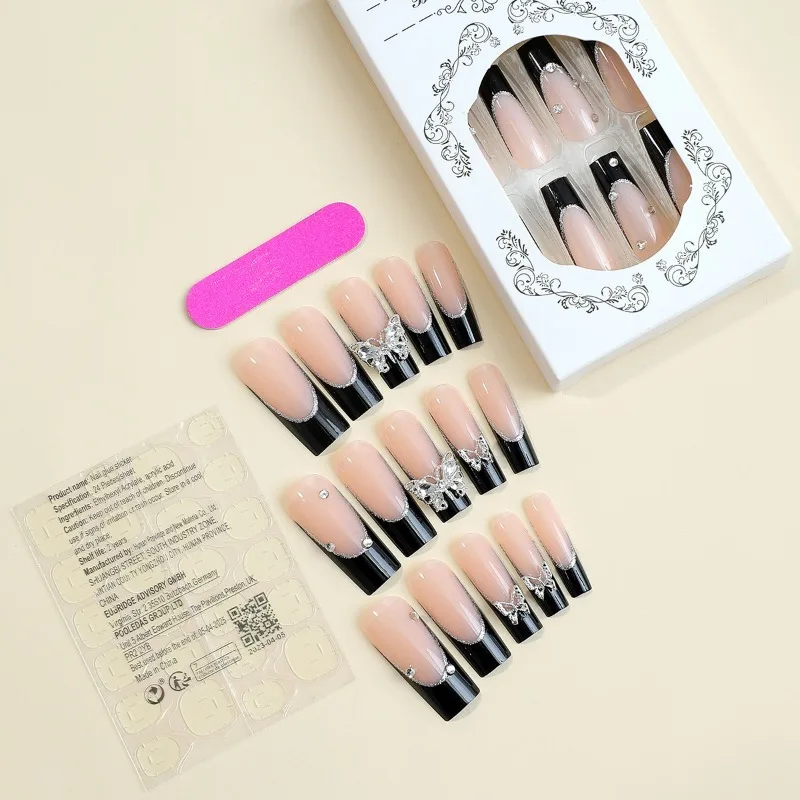 24pcs Glossy False Nail Press on Nail Glitter French Black Long Square with 3D Butterfly Design Full Cover Detachable Nail Tips