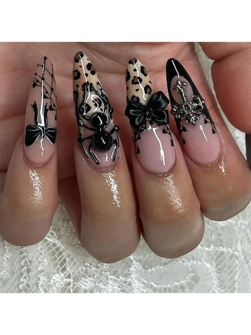 24pcs Long Almond False Nails Black French Ballerina Press on Nails Y2k Flower Bow with Leopard Print Full Cover Fake Nail Tips