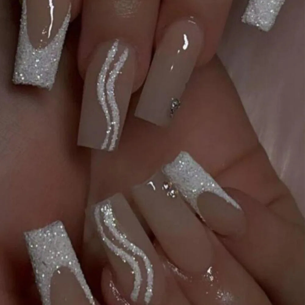 24pcs Medium Ballet False Nails Press on Nail Glitter Powder Simple White Fashion French Fake Nail Detachable Acrylic Nail Tips
