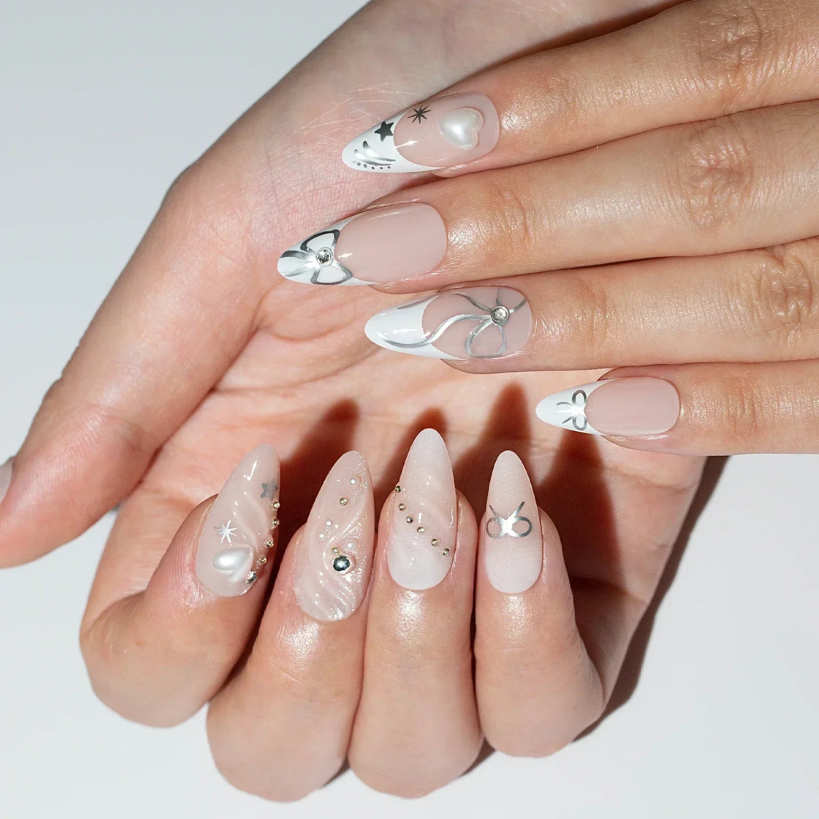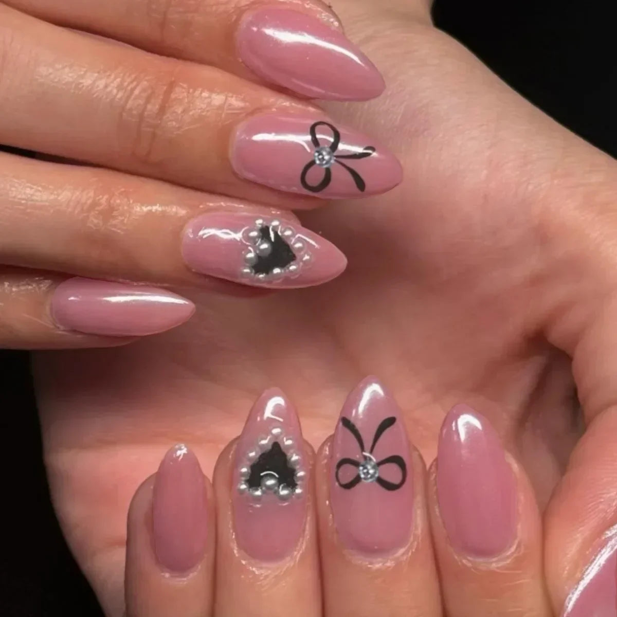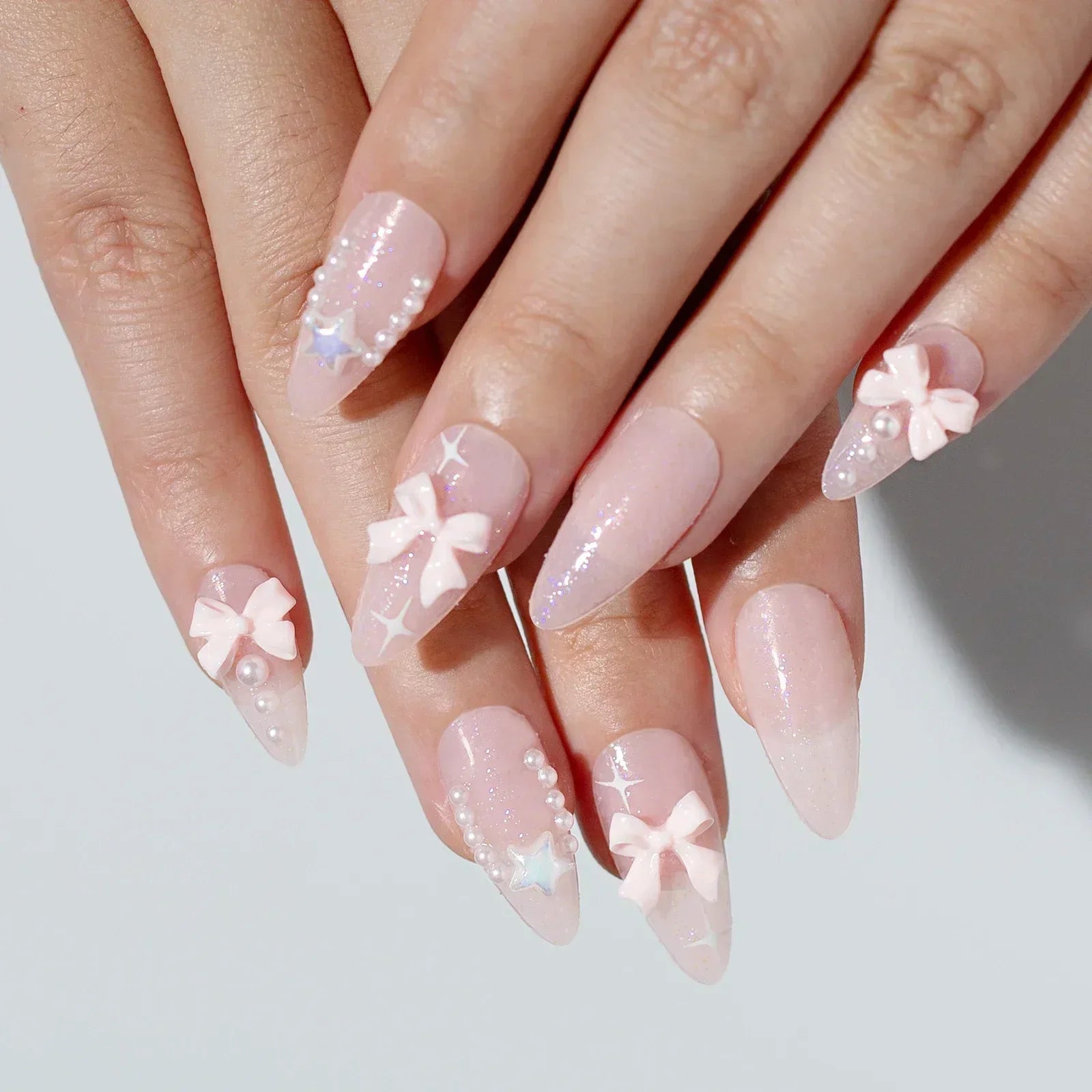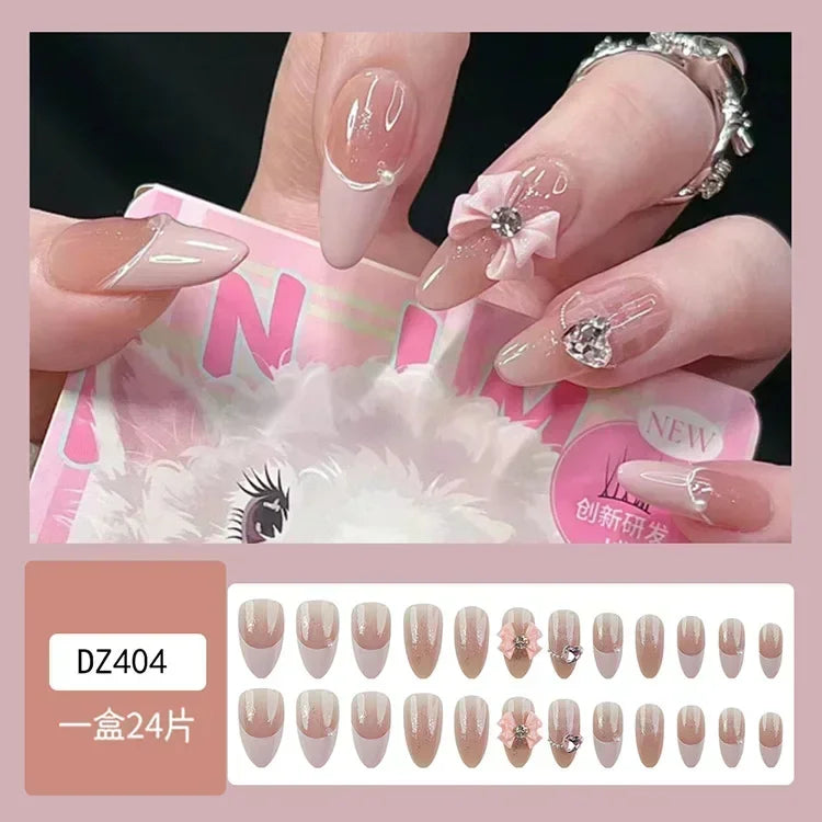 24Pcs Pink Almond French Press on Nails With 3D Bow ripple charms Design Fake Nails Ballerina False Nails Full Cover Nail Tips