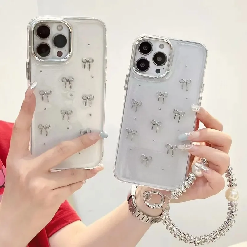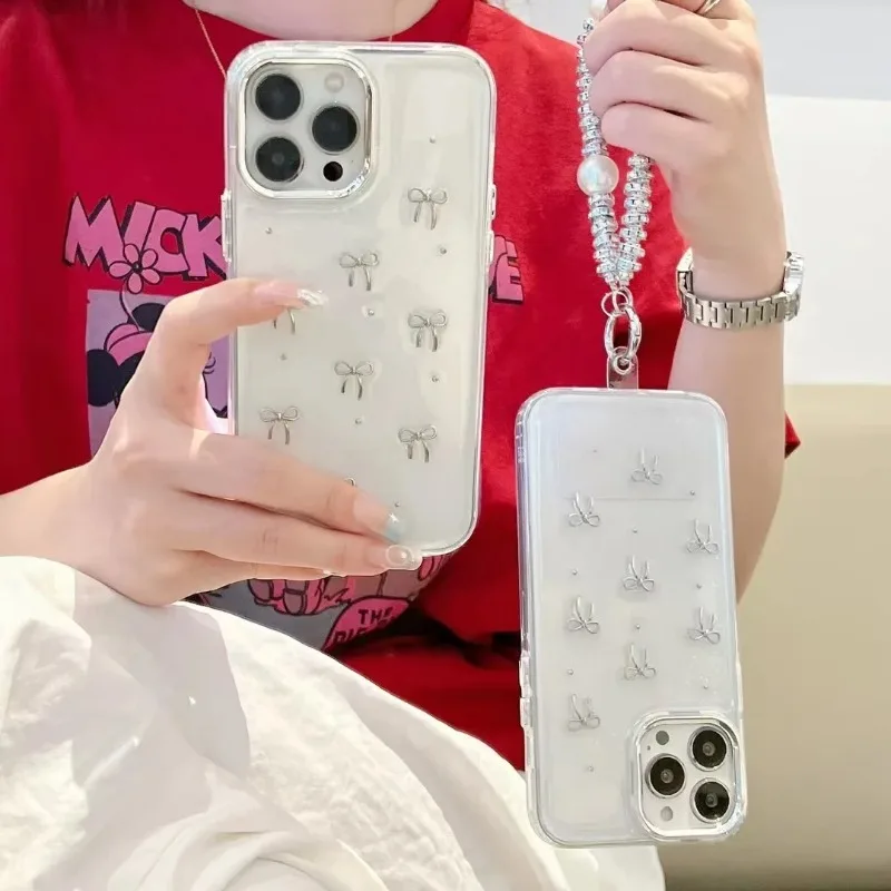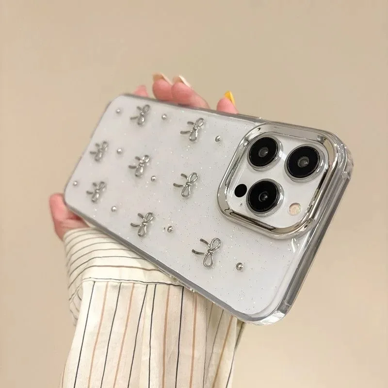 3D Glitter Bowknot Phone Case For iPhone 16 15 14 13 Pro Max Epoxy Clear Glitter Cover Shell Transparent Metal Bow Case
