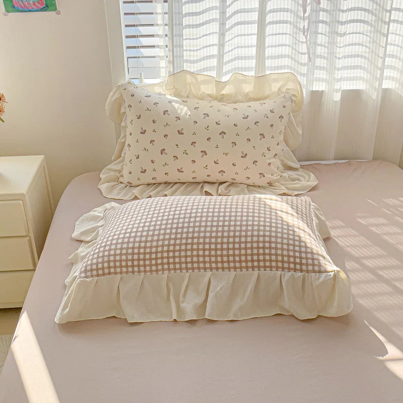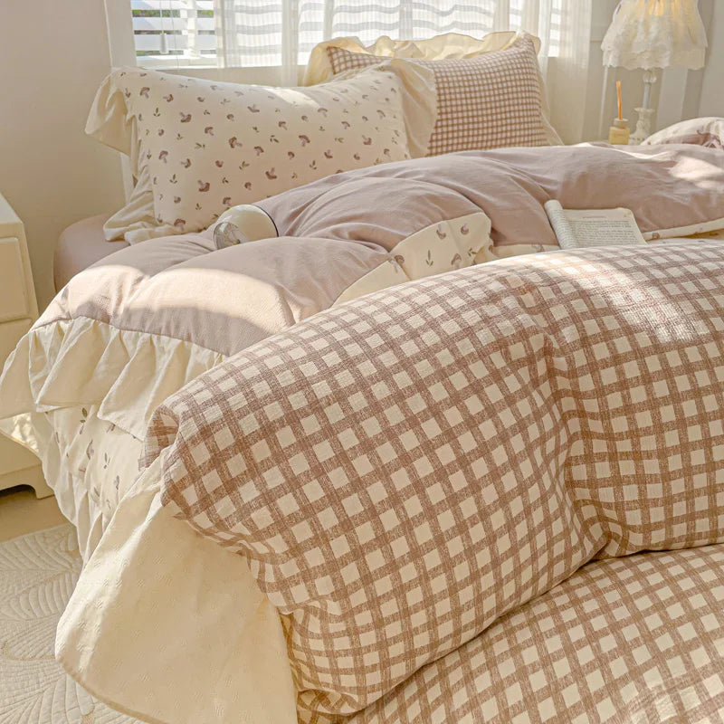 3pcs Korean lace Duvet Cover Set (1*Duvet Cover + 2*Pillowcase, Without Core), Pink checkered print Bedding Set