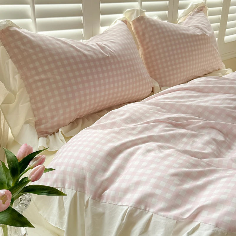 4pcs Korean lace Duvet Cover Set (1*Duvet Cover +1 flat sheet + 2*Pillowcase, Without Core), Pink checkered print Bedding Set