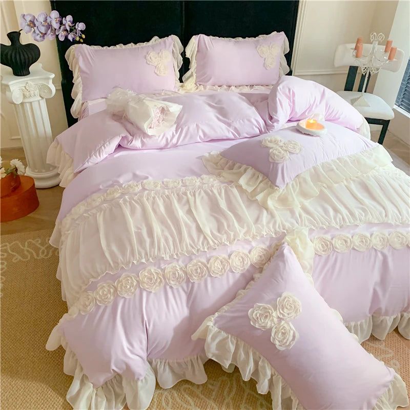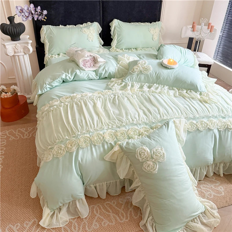 4Pcs Korean Princess Style Flowers Lace Ruffles Bedding Set Queen King Duvet Cover Bed Skirt/Bed Sheet/Fitted Sheet Pillowcase
