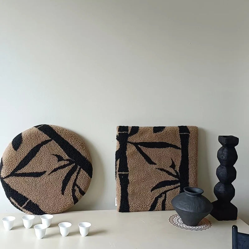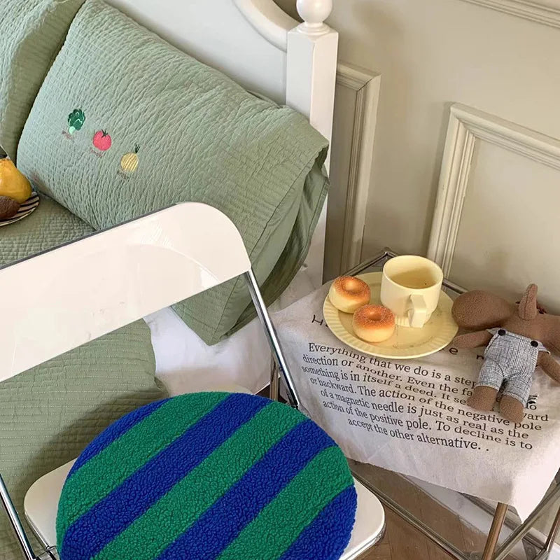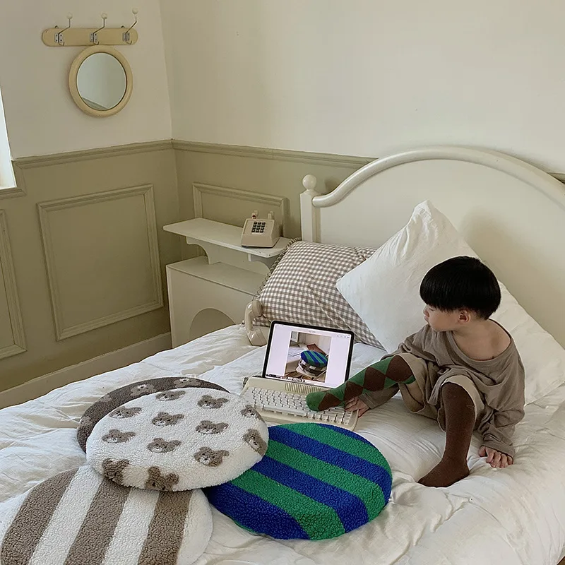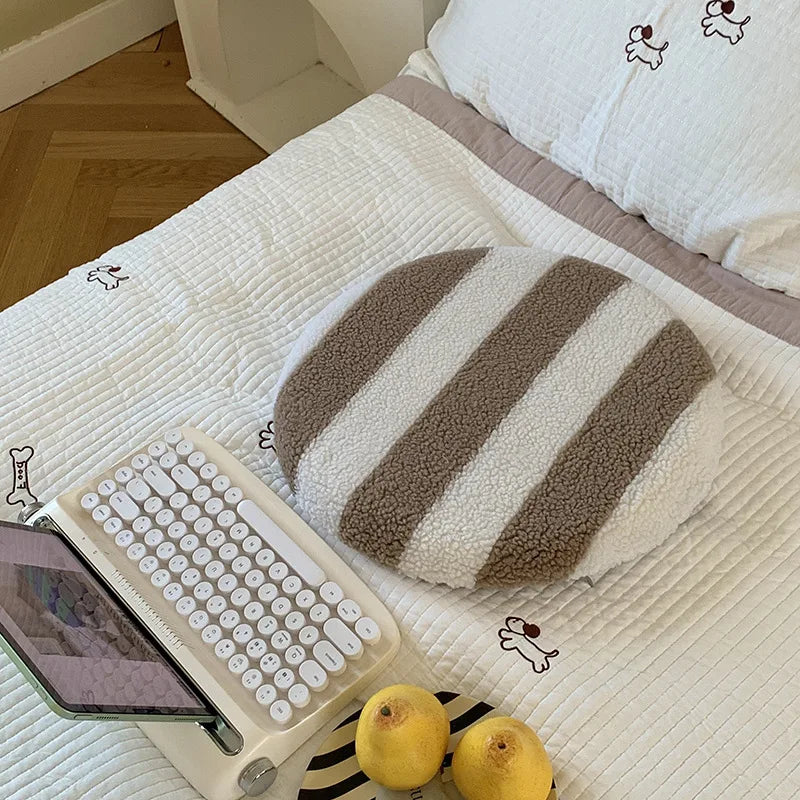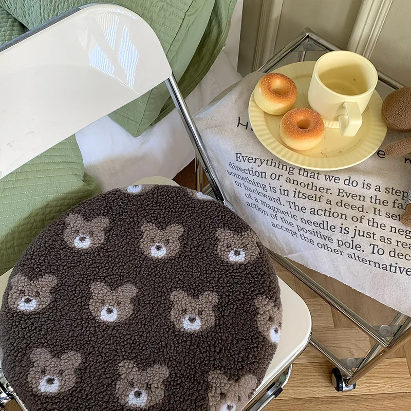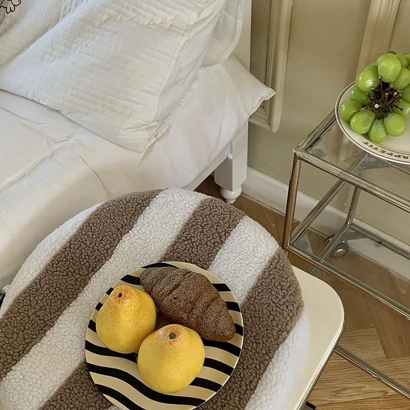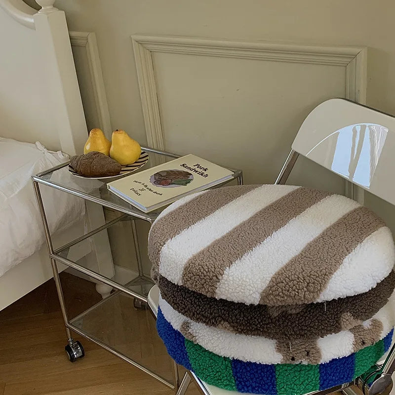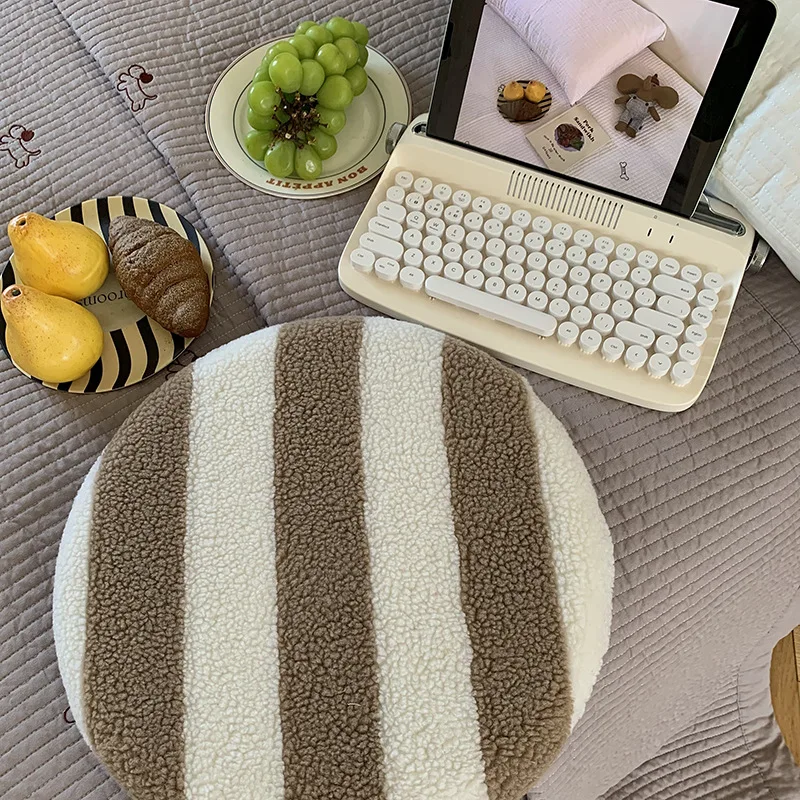The soft, cute little bear and striped lamb fur cushion are here, a round and fluffy one. The little bear is soft, cute, and the stripes are retro and fashionable!