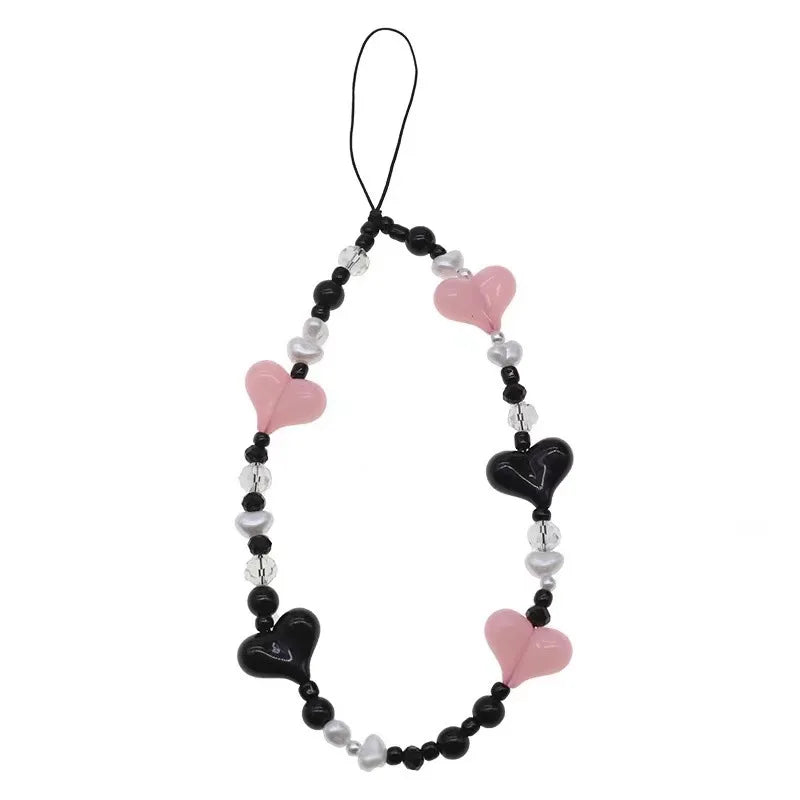 Black Heart Pearl Beaded Charm Phone Pendant Crystal Wristband Keychain Bracelet Lanyard Cord