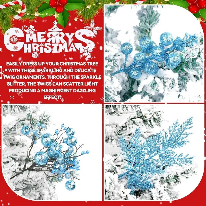 Blue Artificial Flowers Christmas Tree Decoration Glitter Star Light Berries Snowflakes Bow for Home Decor New Year Ornaments