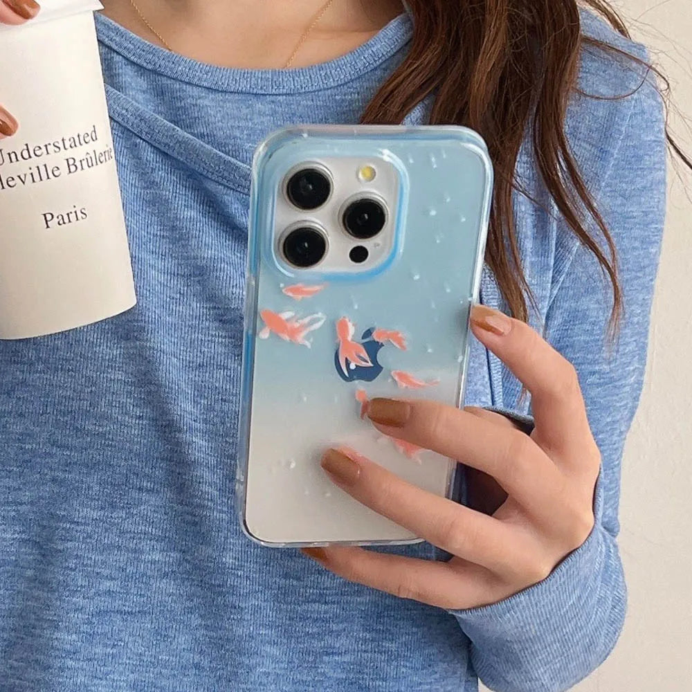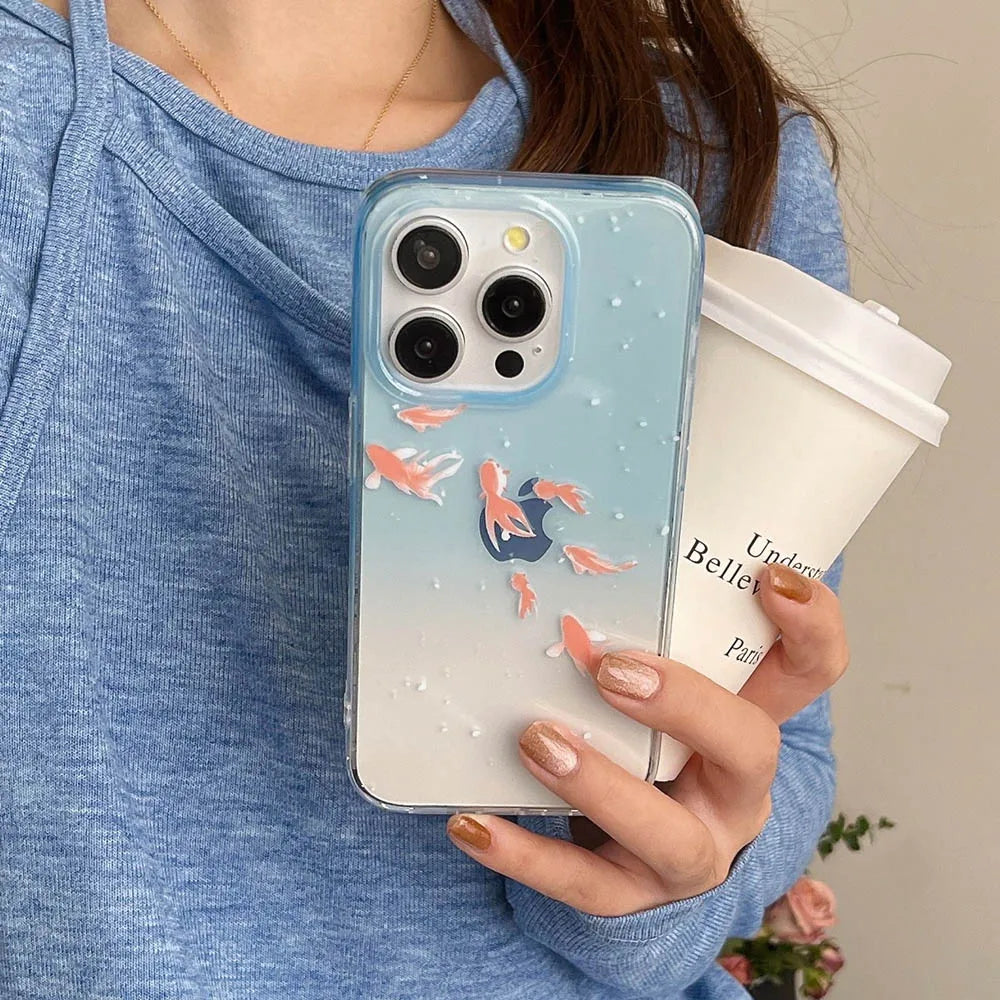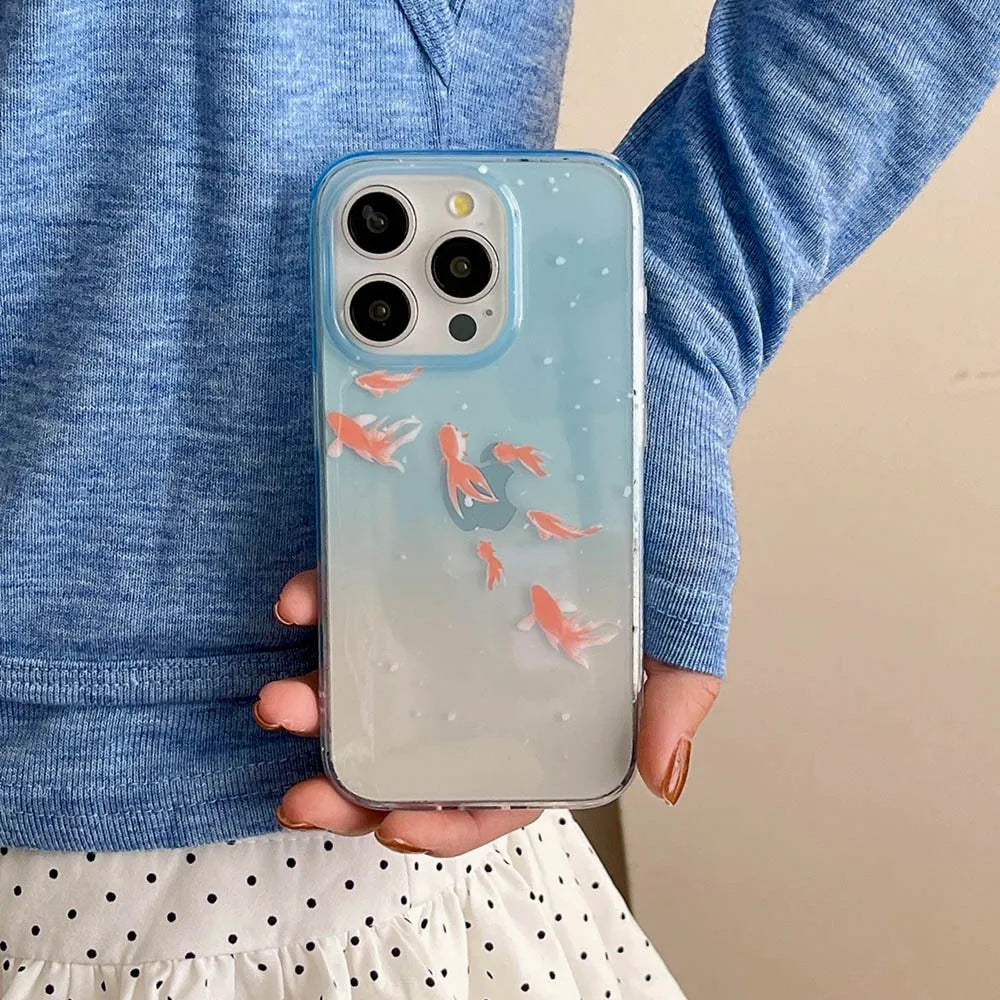 Clear Blue Gradient Koi Fish Gloss Mobile Phone Protective Case For iPhone 12 13 14 15 Pro Max Coque For iPhone 16 Pro Max Cover