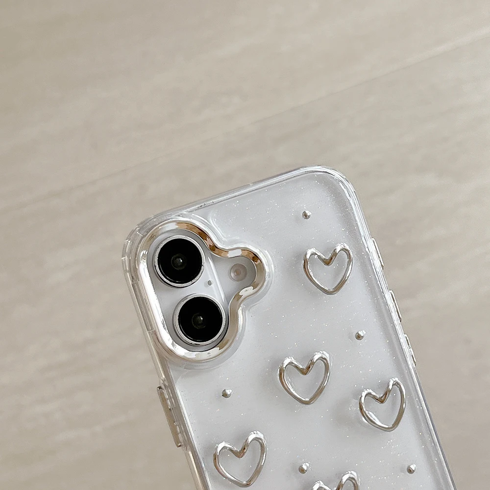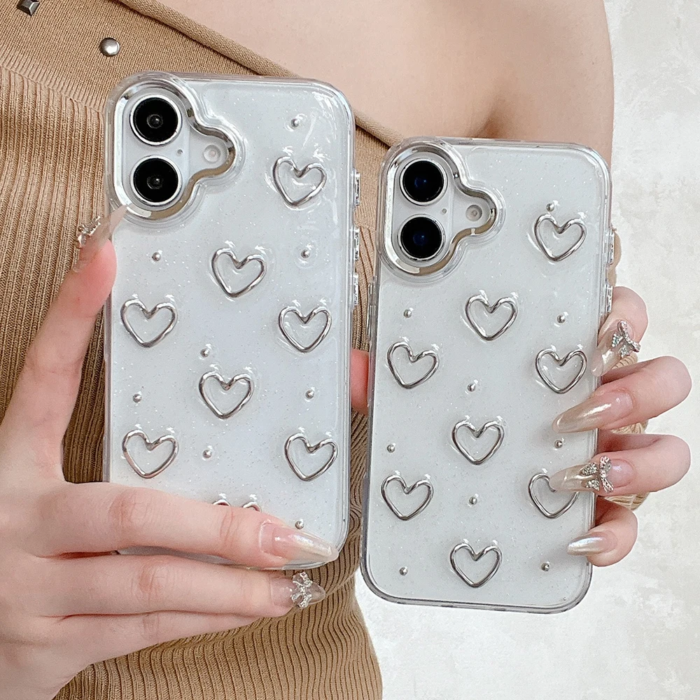 Cute 3D Silvery Love Heart Phone Case For iPhone 16 15 14 13 12 11 Pro Max Soft Shockproof Transparent Cover Epoxy Glitter Shell