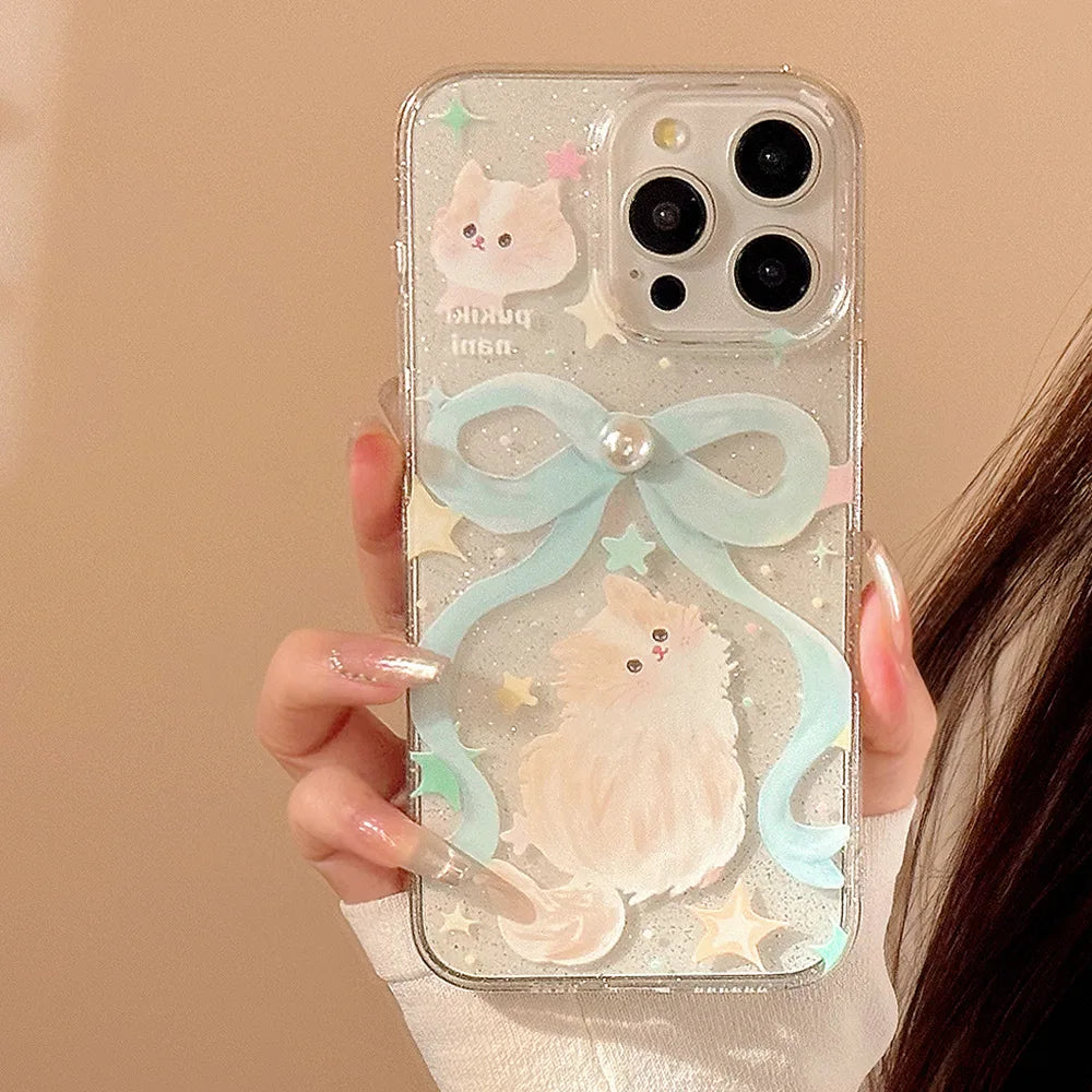 Elegant pearl blue bow bracelet capa for iphone 13pro 15pro 11 13 12 13promax 14 15 pro max 14pro cute cat shiny star phone case