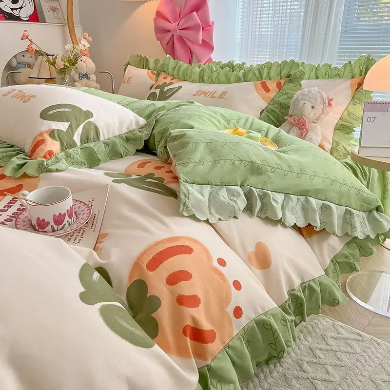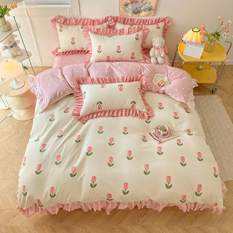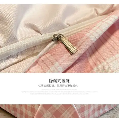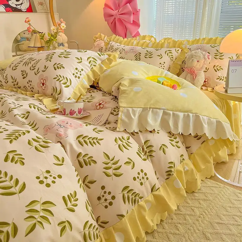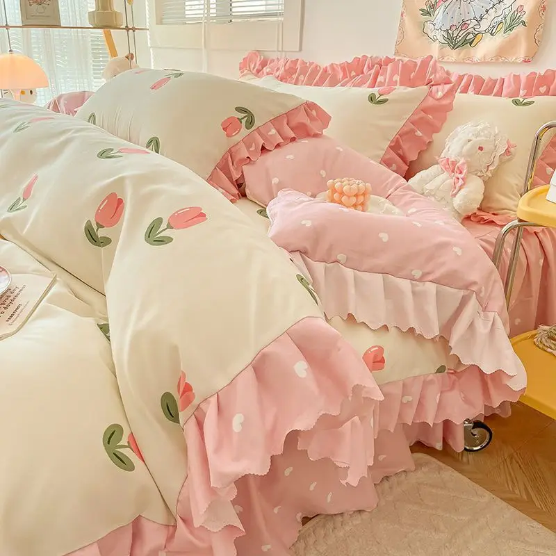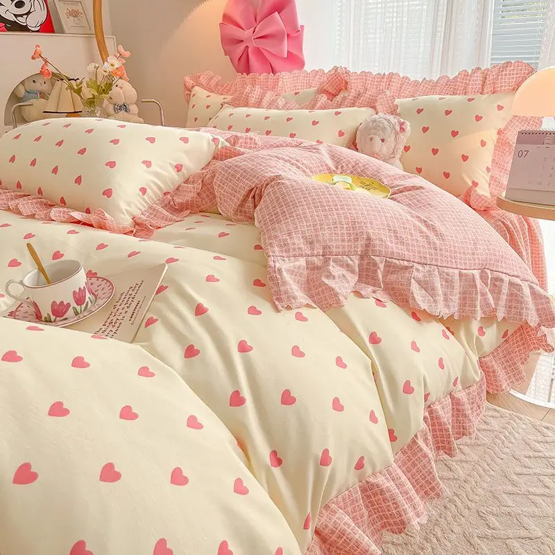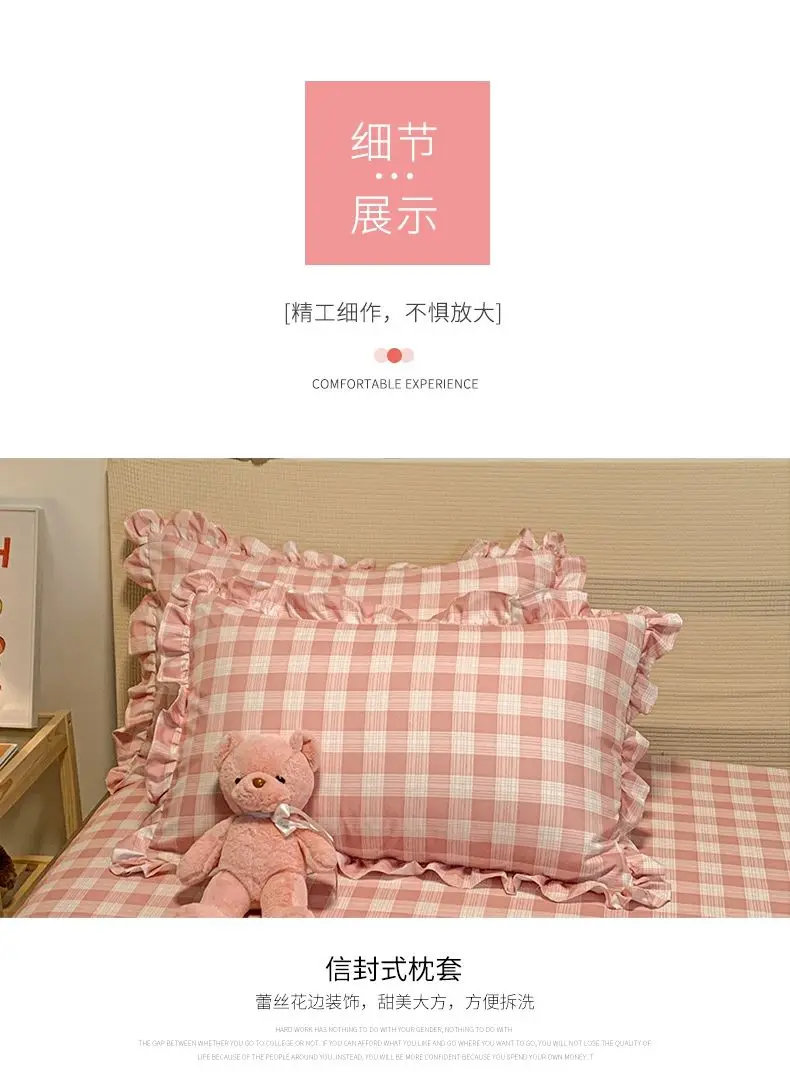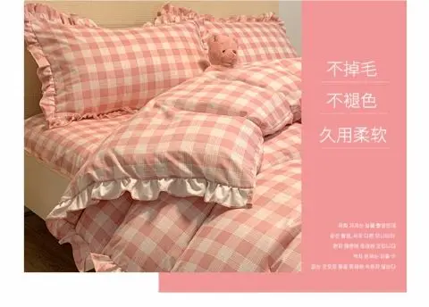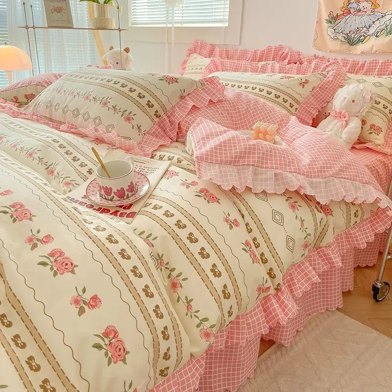 Fashion Lattice Bedding Set Bed Sheet Cute Princess AB Double Sided Ruffle Flower Quilt Cover Pillowcase Bedclothes Home Textile