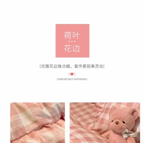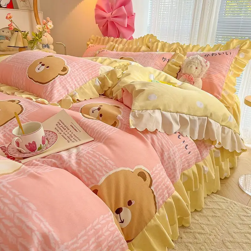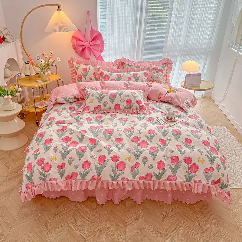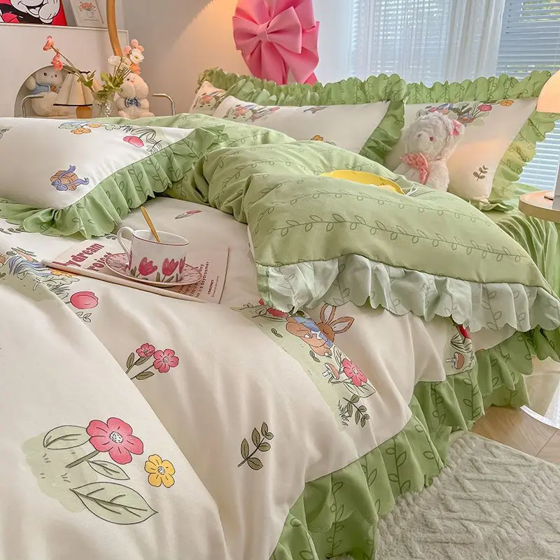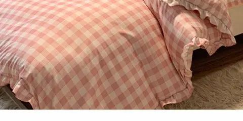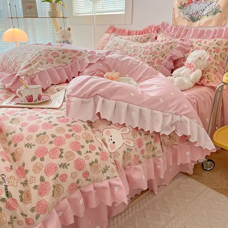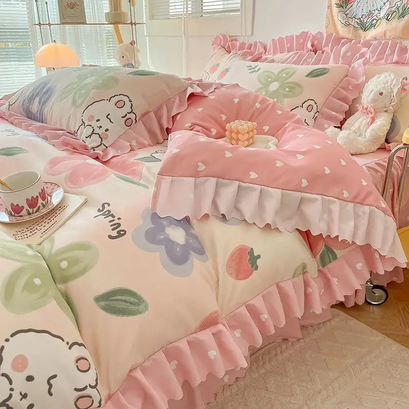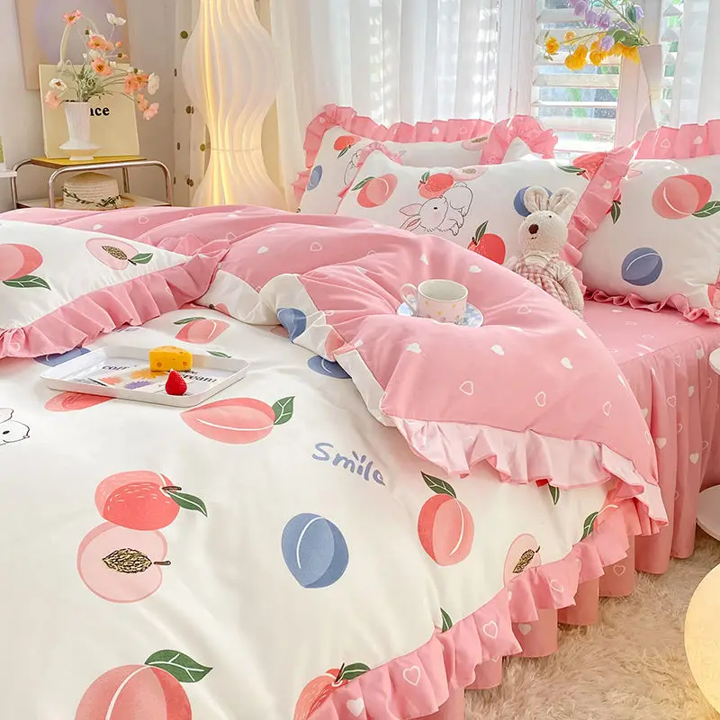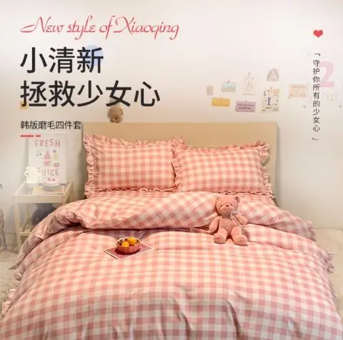 Fashion Lattice Bedding Set Bed Sheet Cute Princess AB Double Sided Ruffle Flower Quilt Cover Pillowcase Bedclothes Home Textile