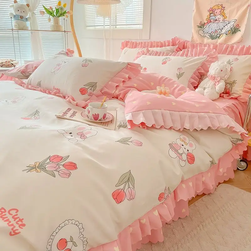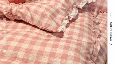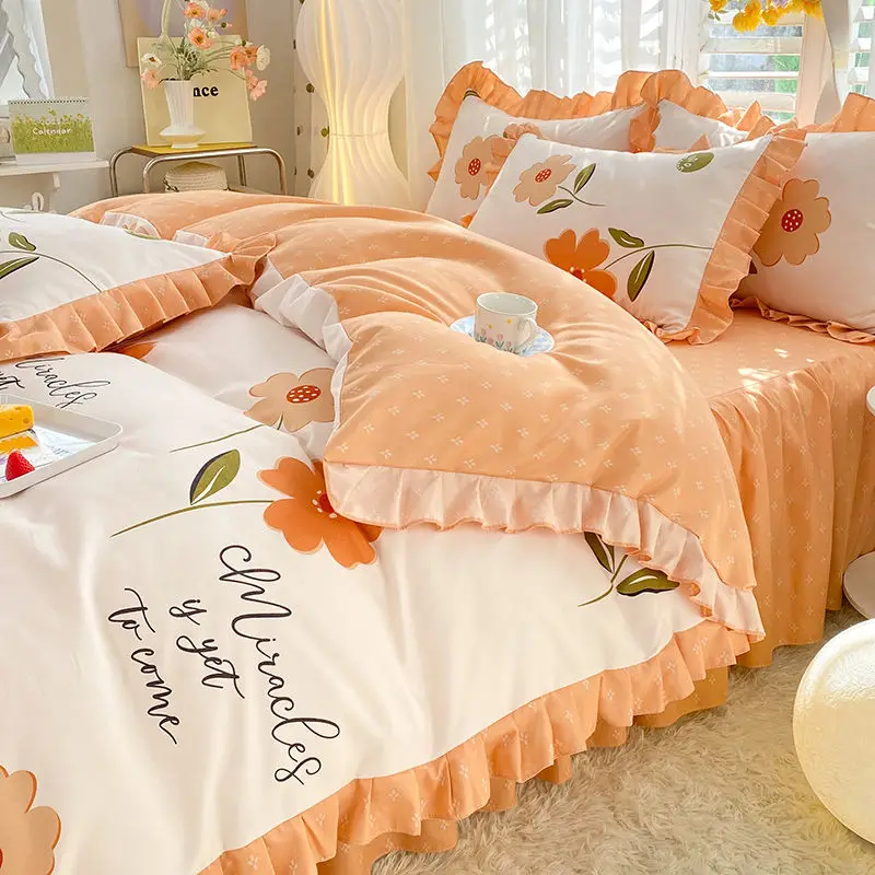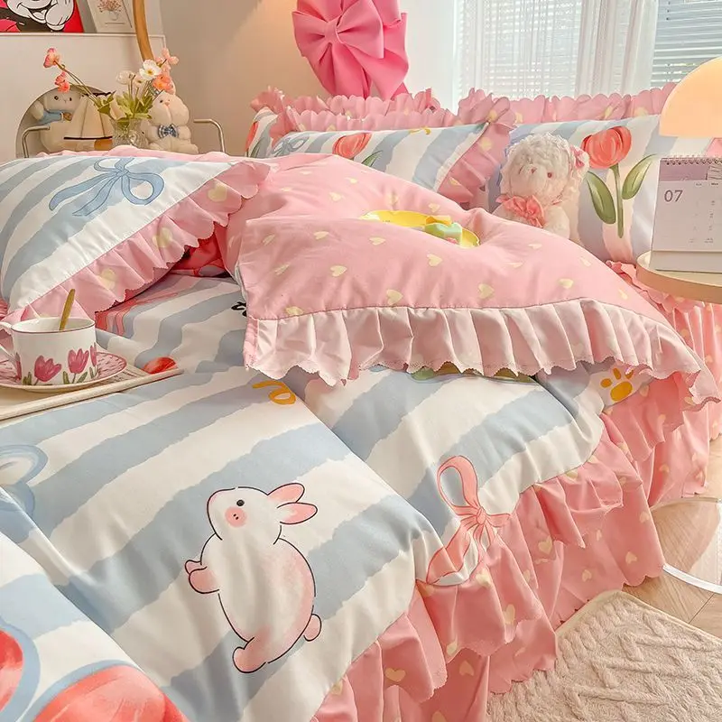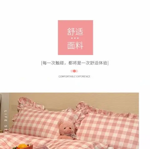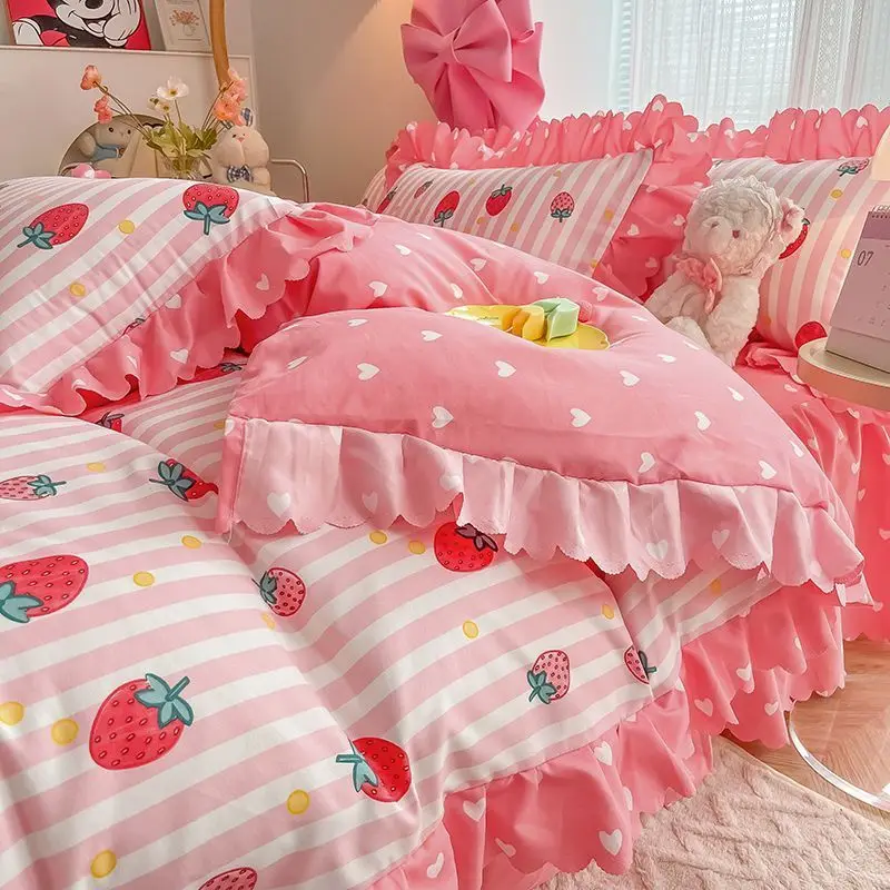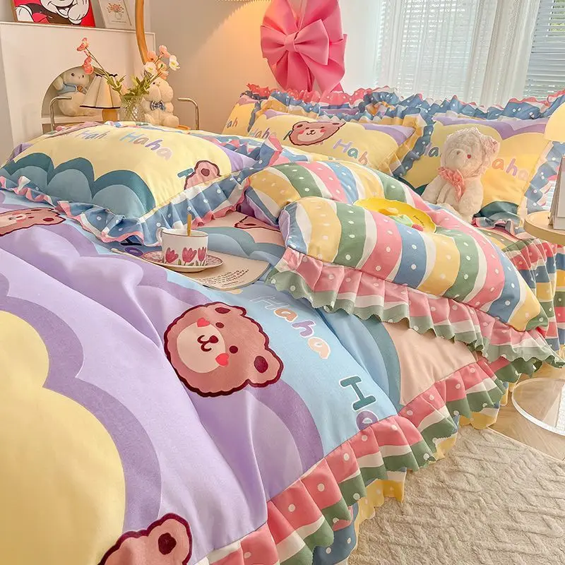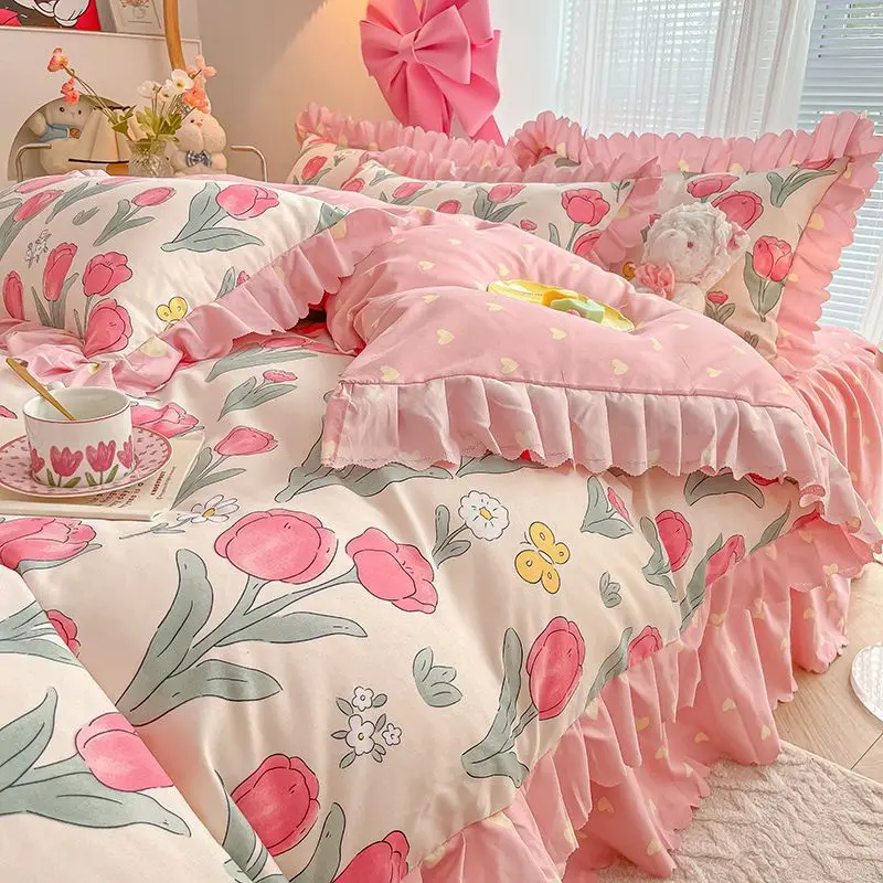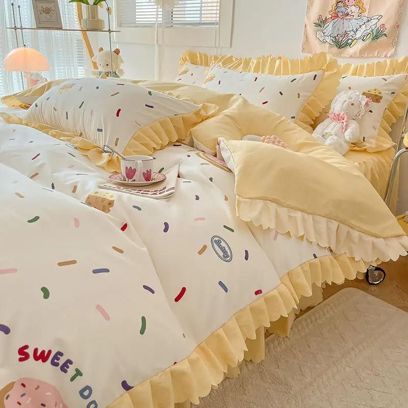 Fashion Lattice Bedding Set Bed Sheet Cute Princess AB Double Sided Ruffle Flower Quilt Cover Pillowcase Bedclothes Home Textile