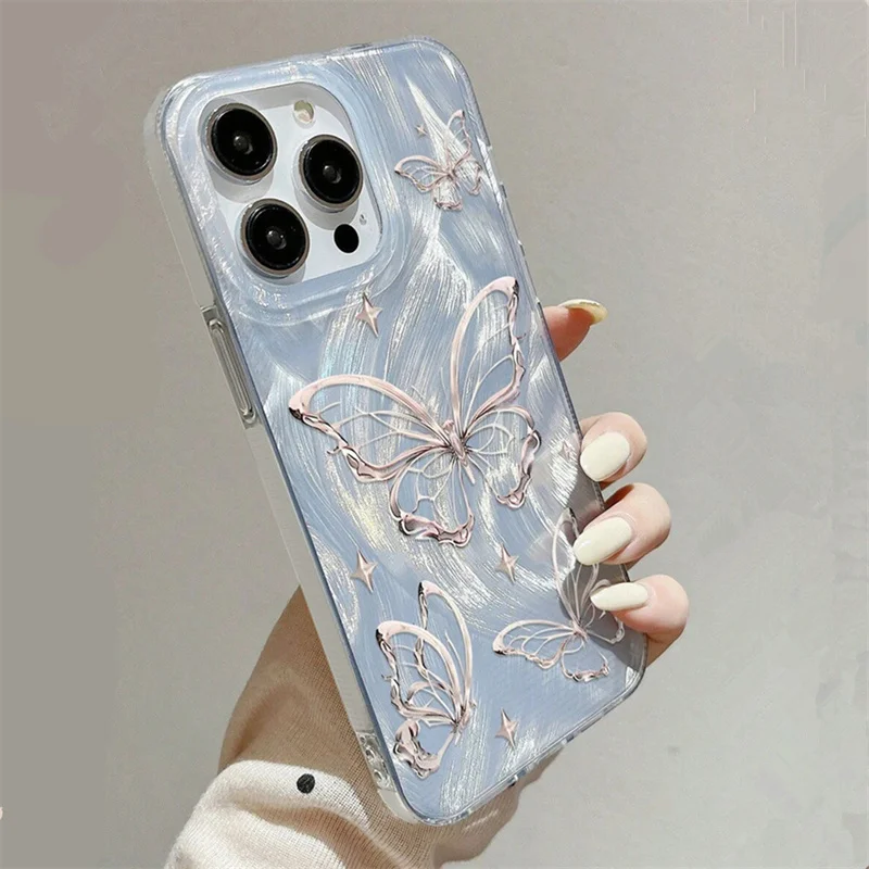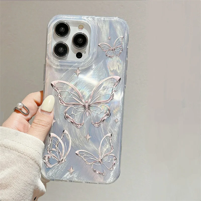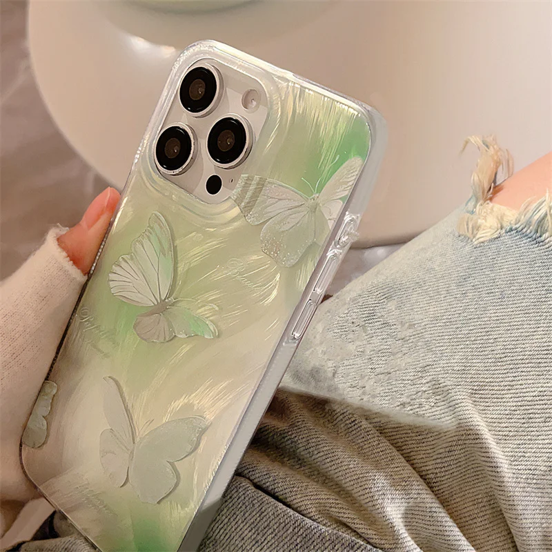 Green Gradient Butterfly Pattern Phone Case For iPhone 11 12 13 14 15 Pro Max XR XS X 7 8 Plus SE 2022 Shockproof Glitter Cover