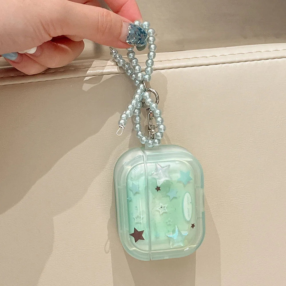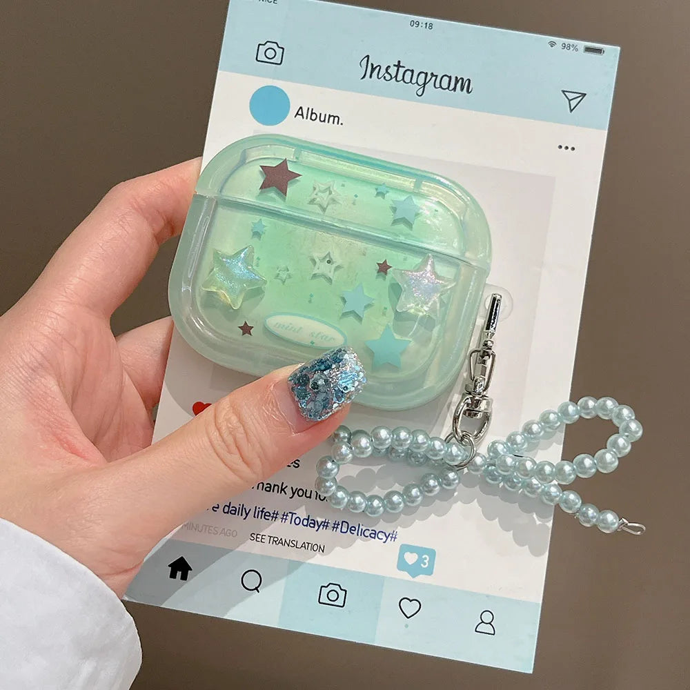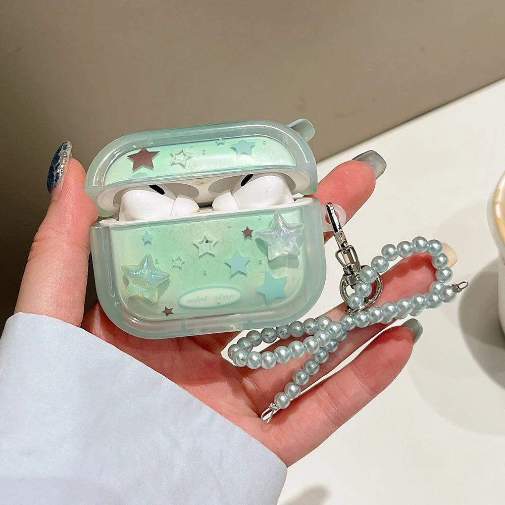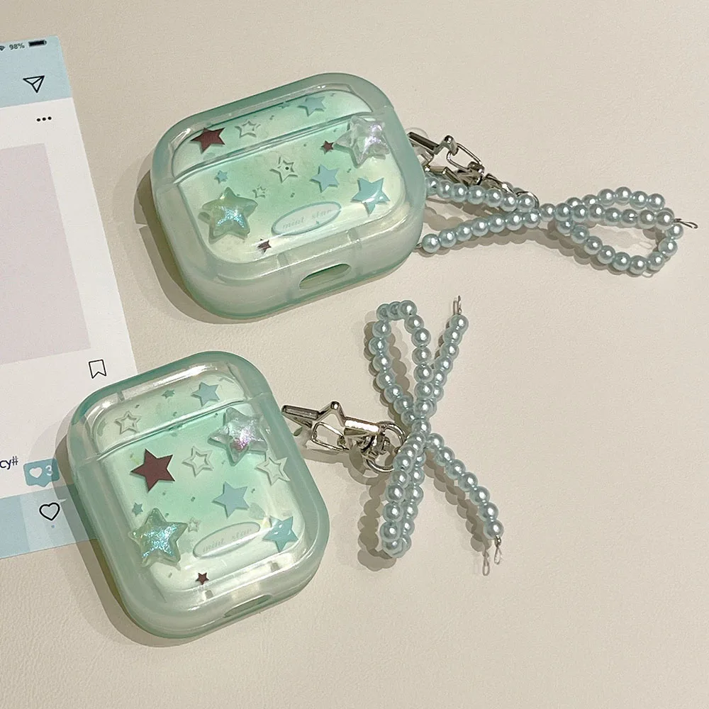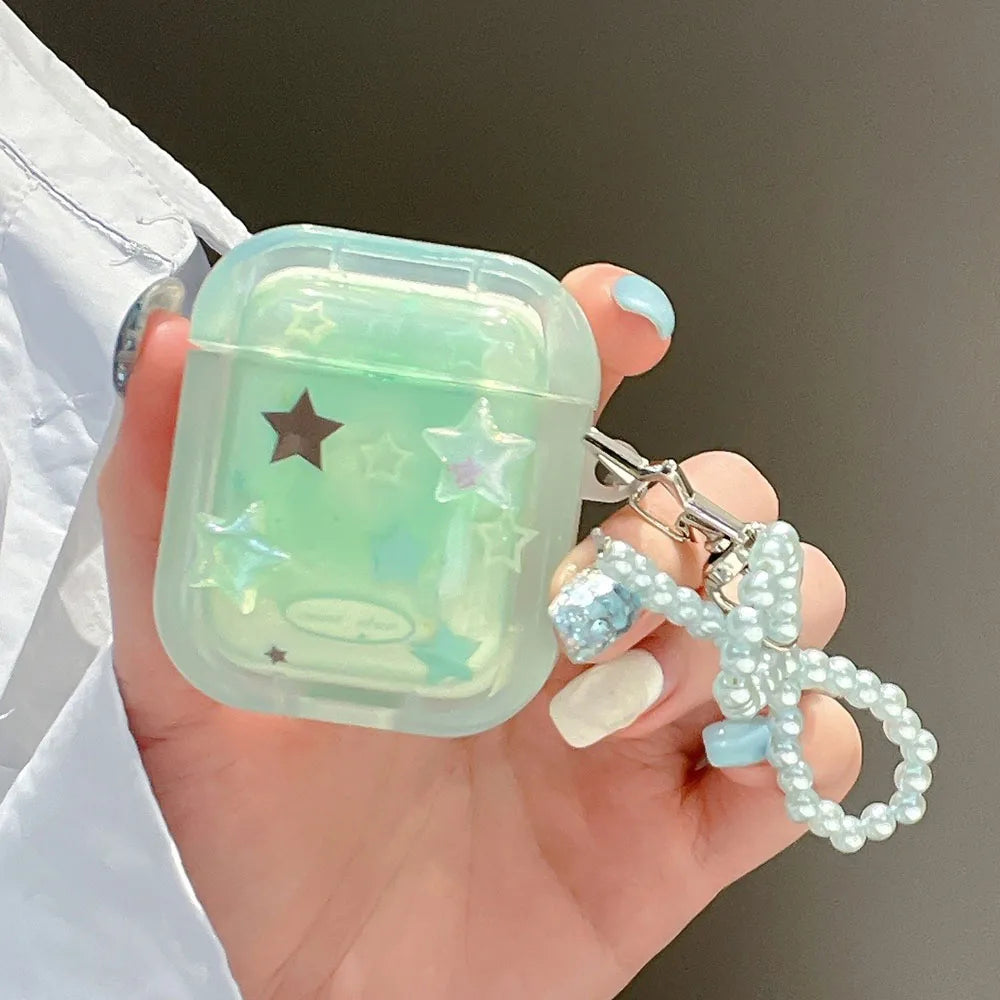 Green Stars Case with Pearl Bow Keychain For Apple AirPods 1 2 3 4 Pro 2 Bluetooth Earphone Cover funda For AirPods2 AirPod Pro2