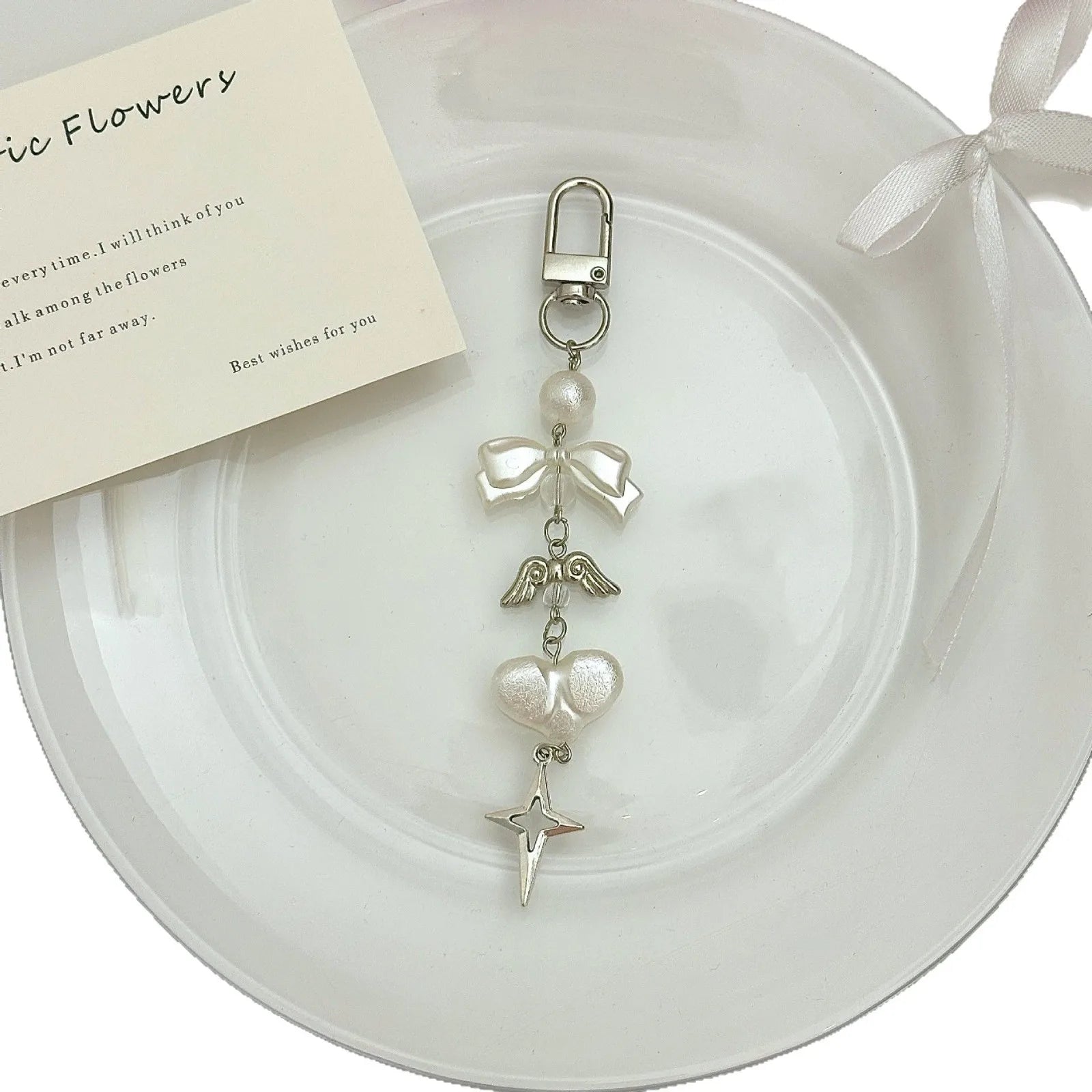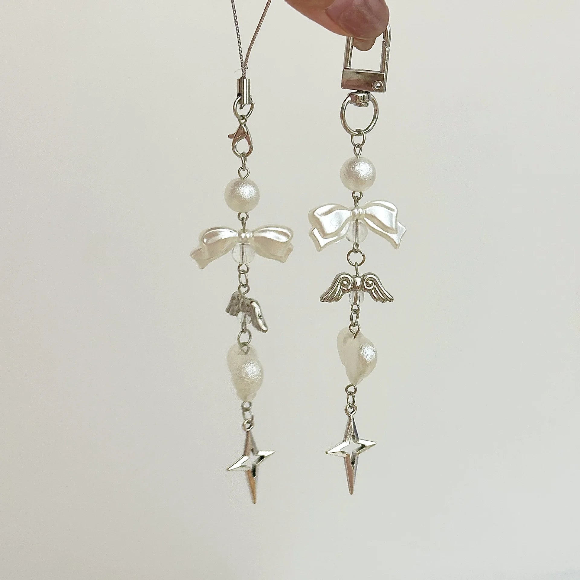 INS Korea Pearl Bow Knot Heart Charm Phone Pendant Crystal Wristband Keychain Bracelet Lanyard Cord