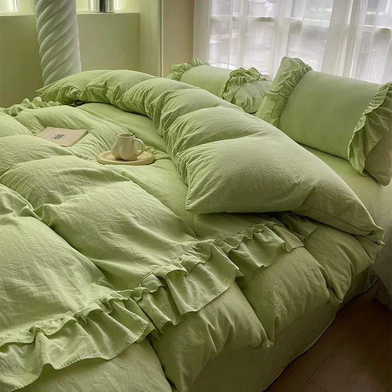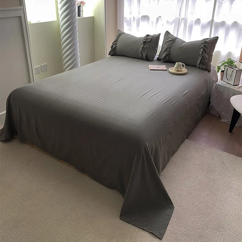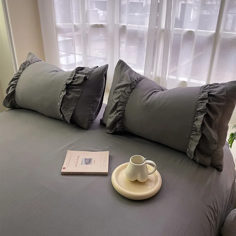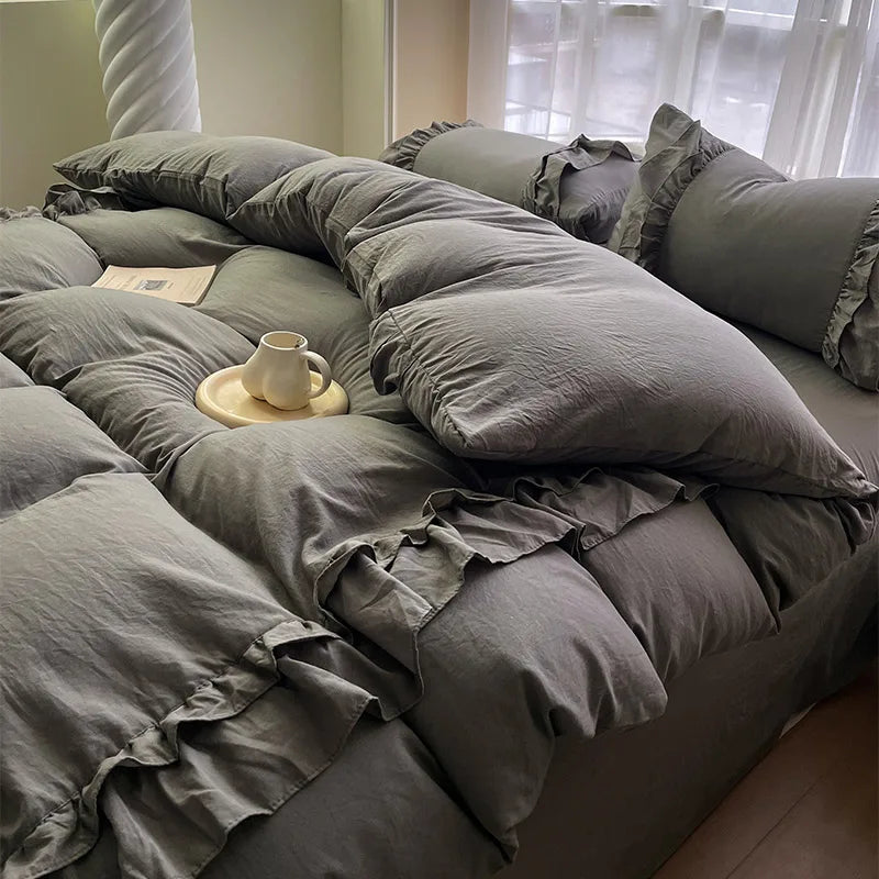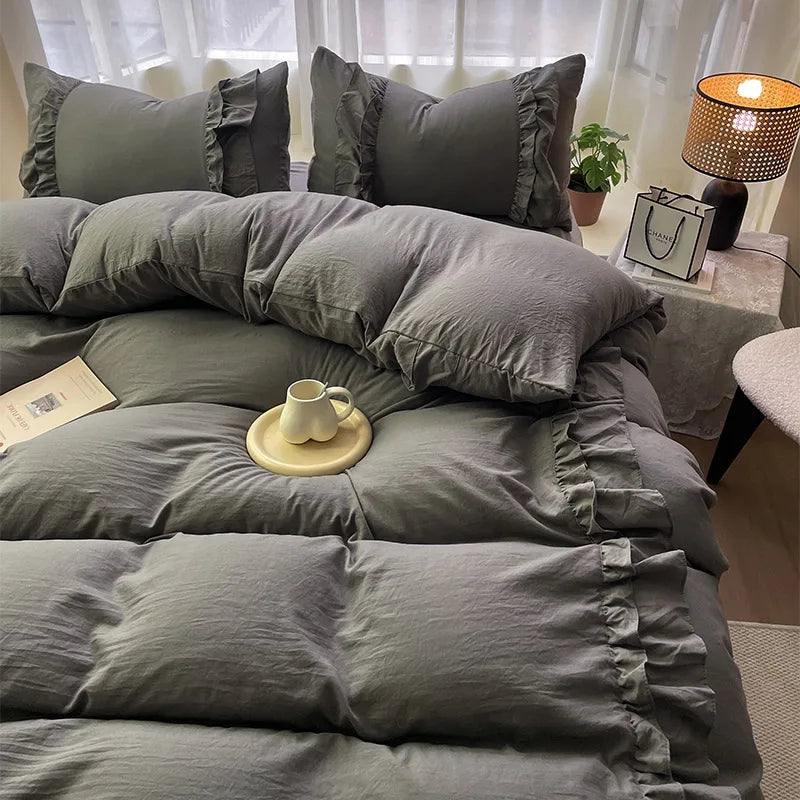 INS Princess Grey Bedding Sets 2025 Solid Color Ruffle Quilt Cover Romantic Bed Sheet Sets Girls Bedroom Duvet Cover 4pcs