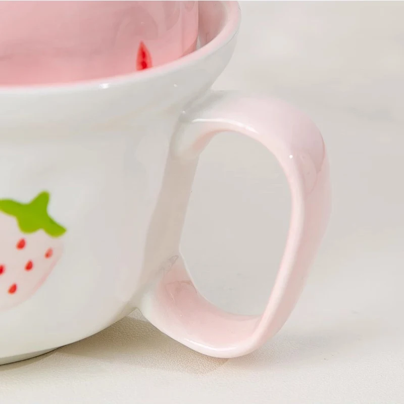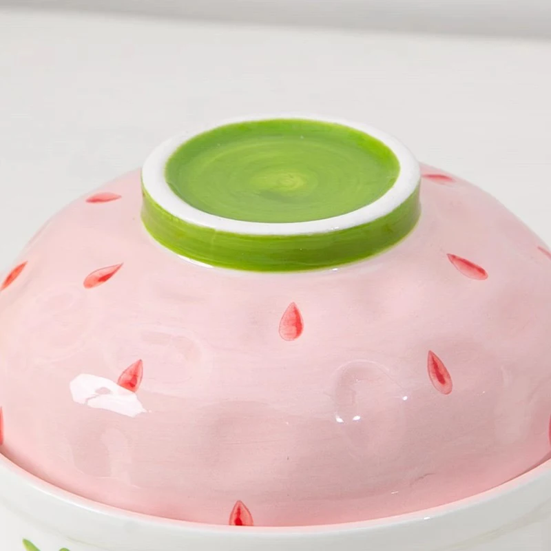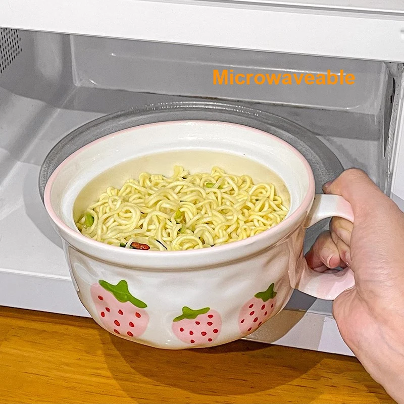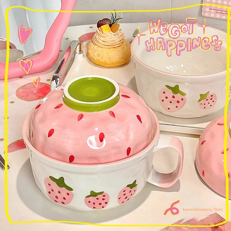 Kawaii Strawberry Ramen Bowl With Lid Ceramics Cute Fruit Soup Salad Instant Noodles Large Bowl Home Kitchen Tableware 700ml