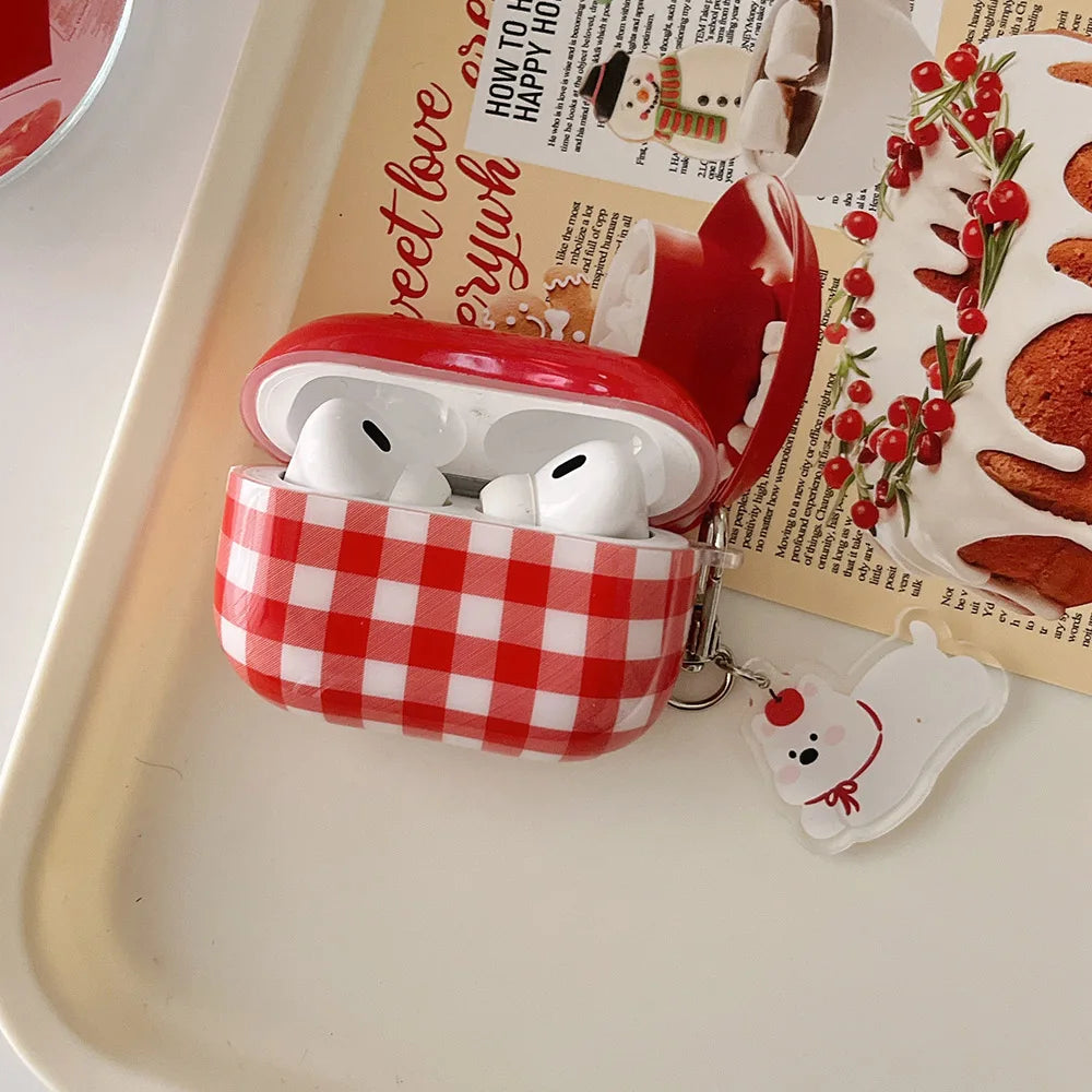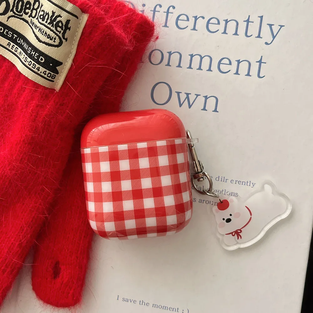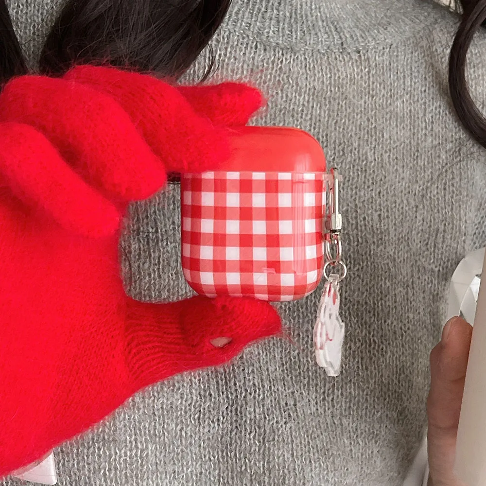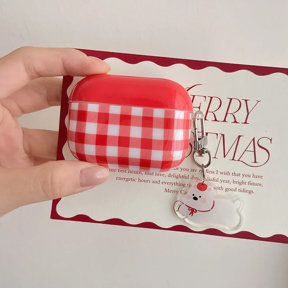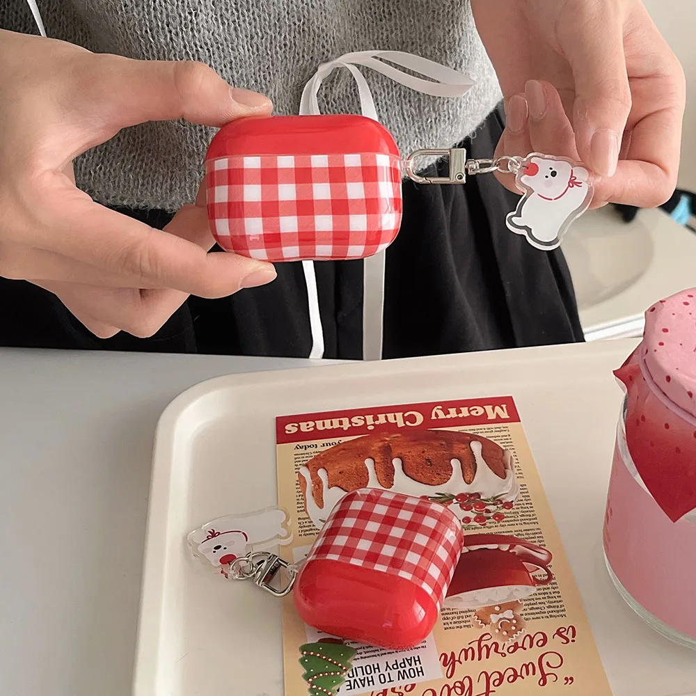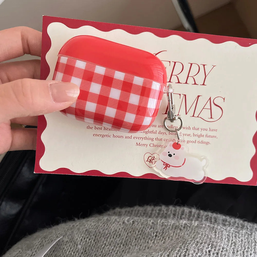 Korea Lovely Red Grid Pattern Soft Silicone Apple Earphone Case For AirPods 1 2 3 4 Pro 2 Cartoon Cute Dog Pendant New Year Case