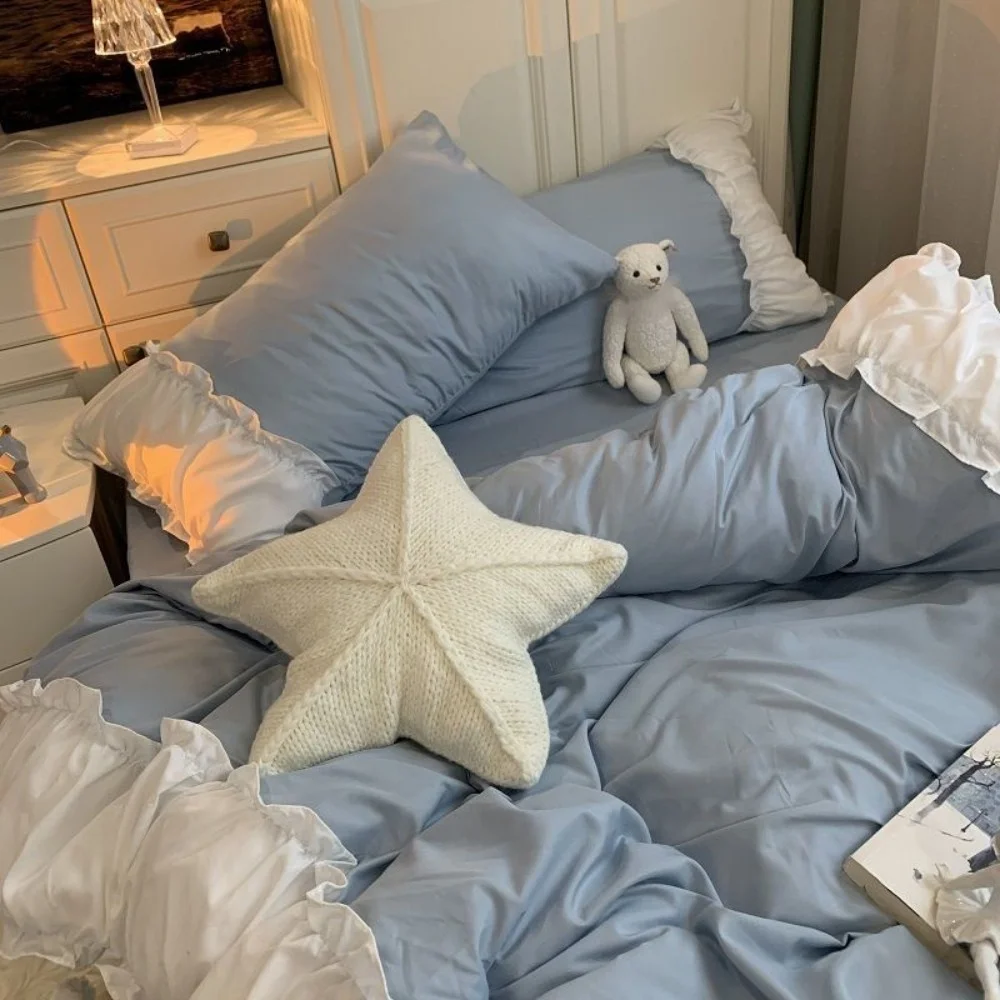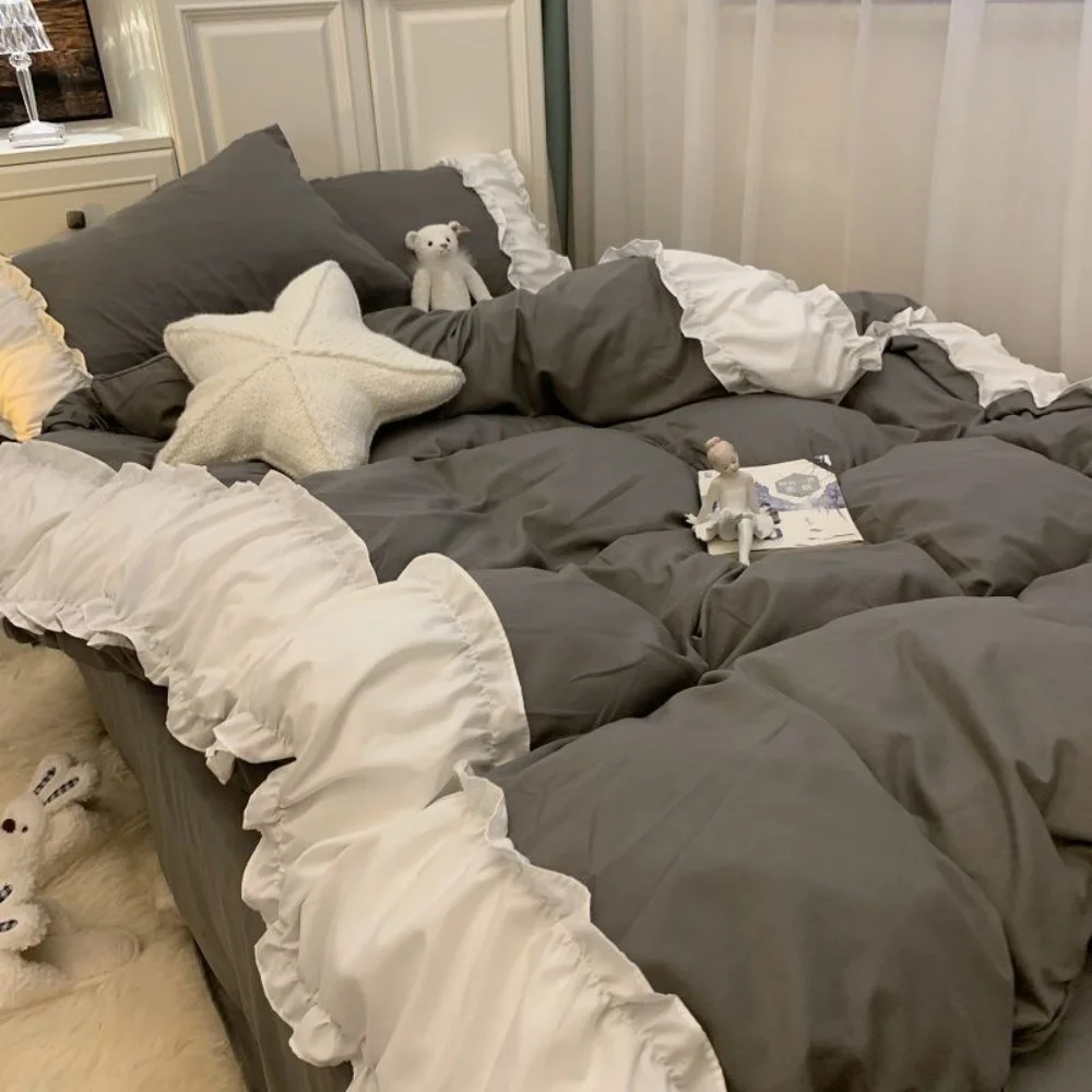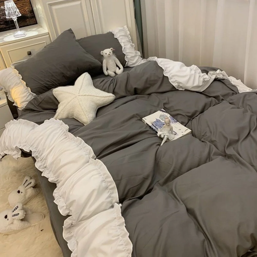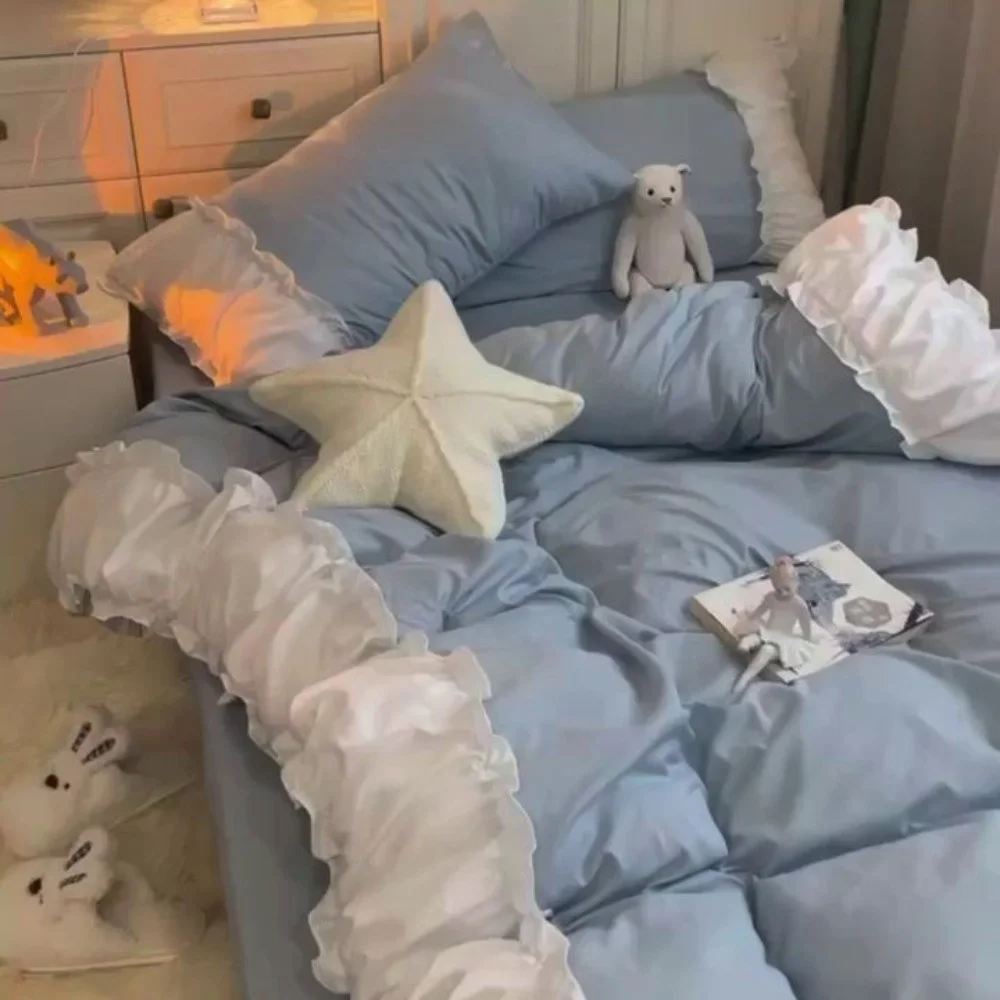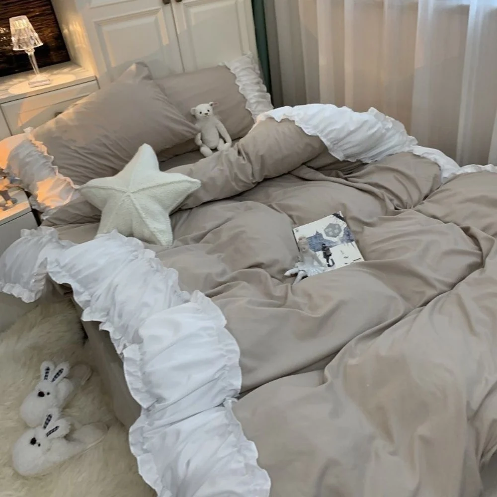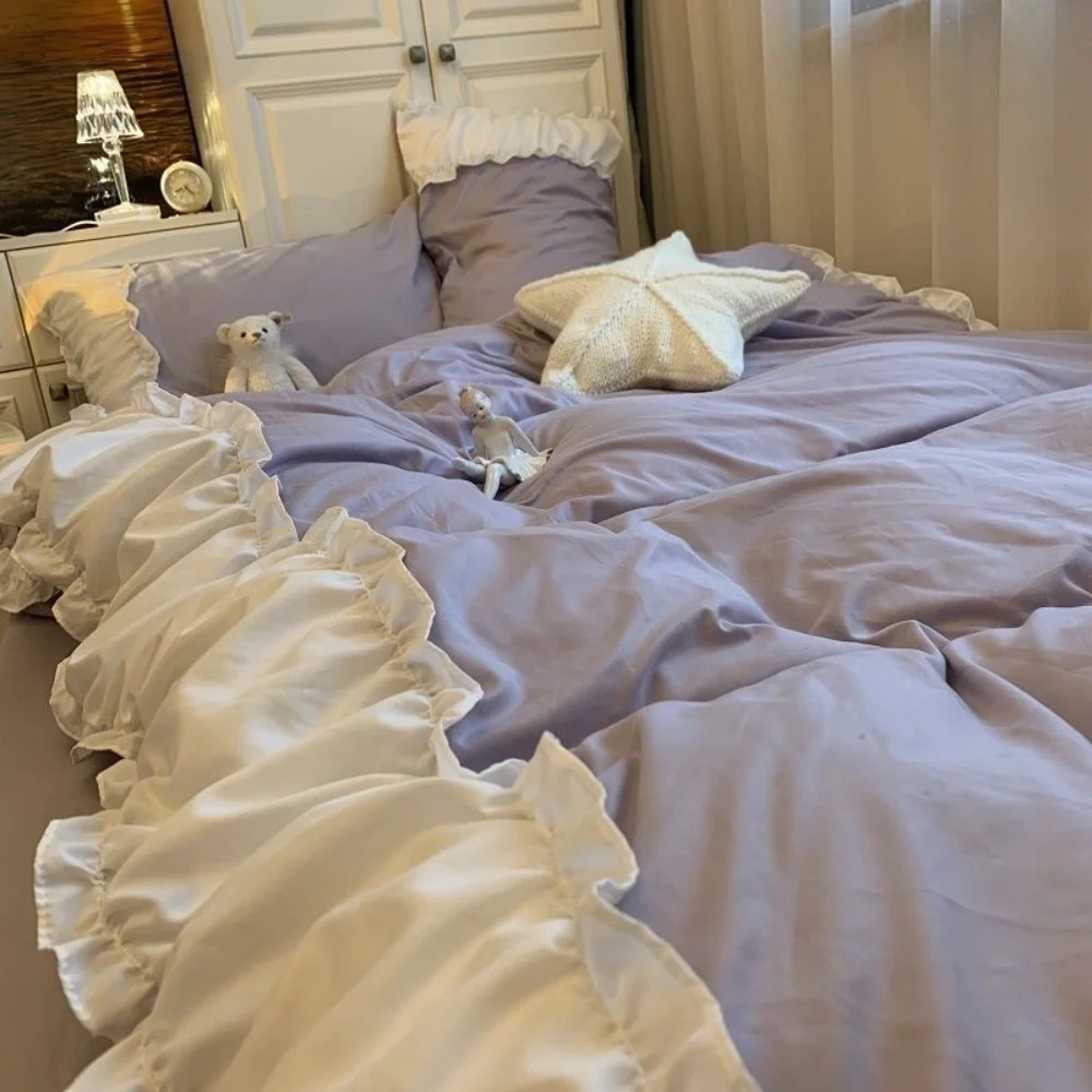Korea Princess Purple Bedding Sets Bed Sheet Pillowcases Duvet Cover 3/4 Pieces Home Decoration Washed Cotton Flat Sheet Set