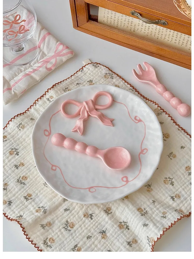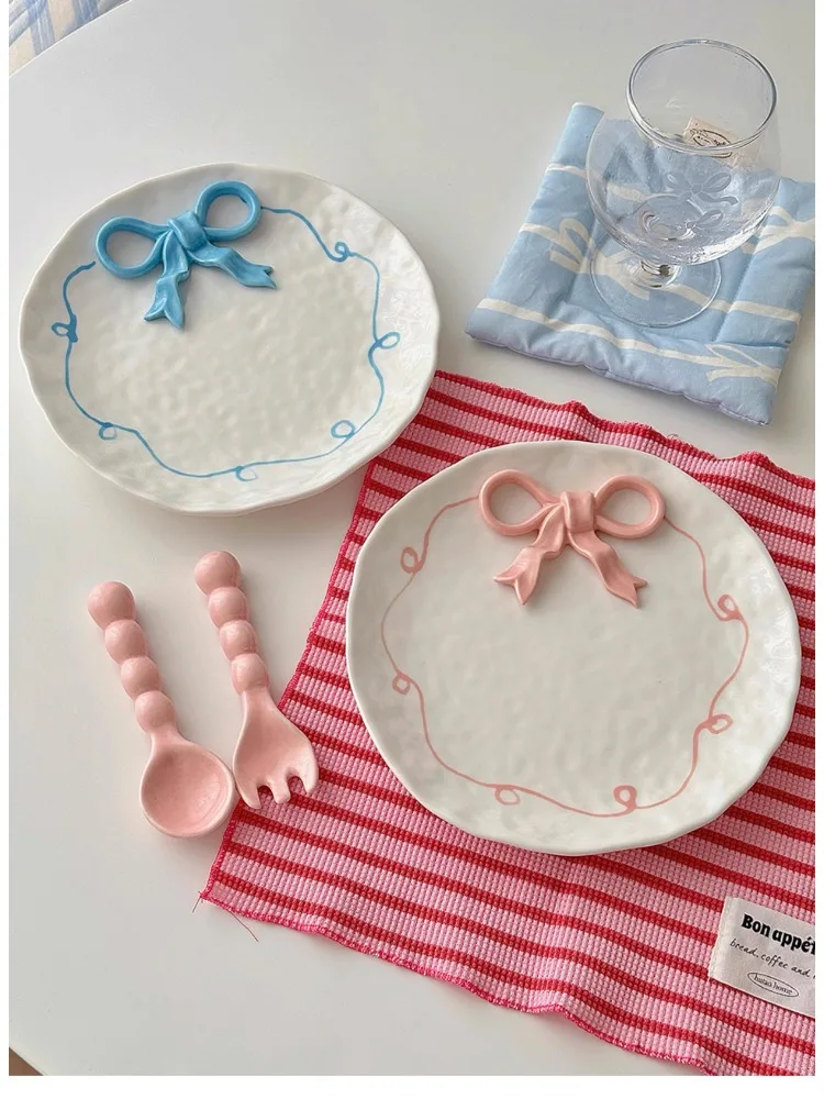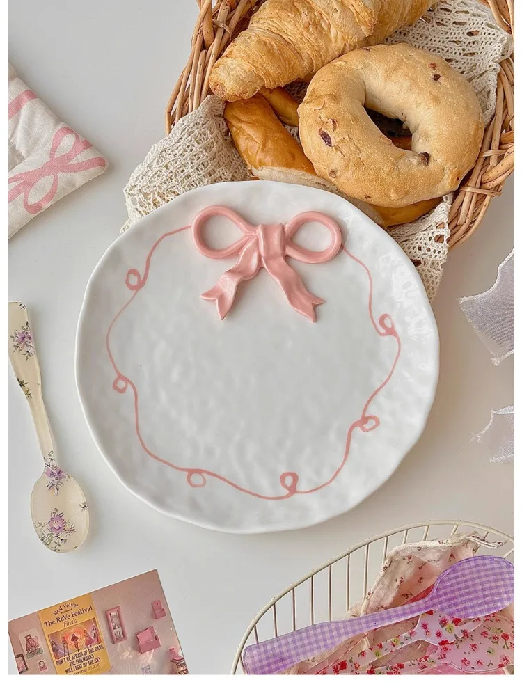 Korean Handmade Bow Plate Pink and Tender Girl's Heart Plate Dessert Fruit Plate Underglaze Color