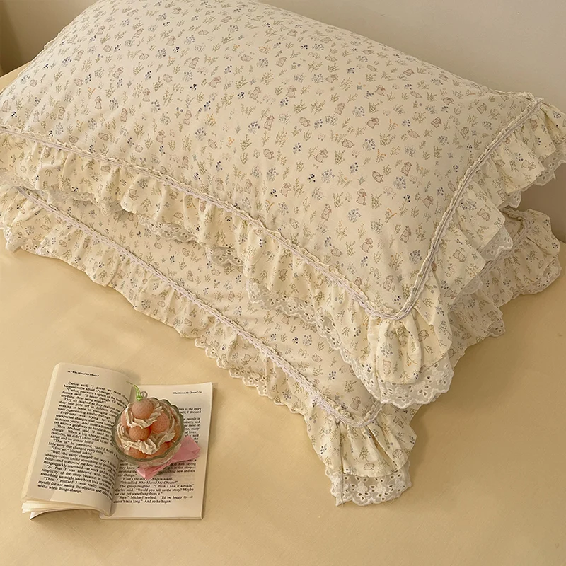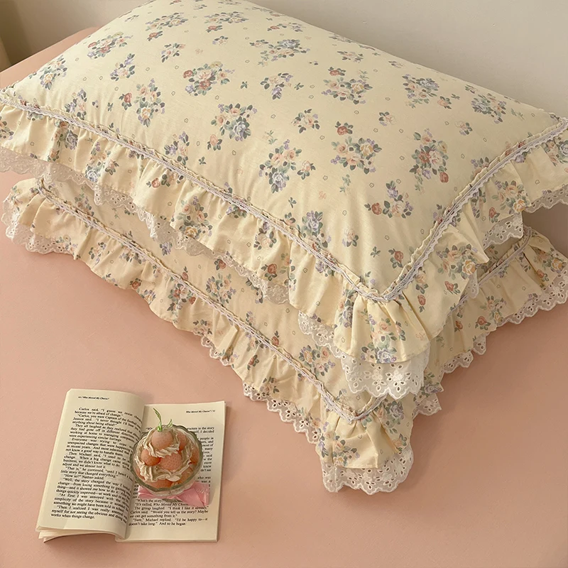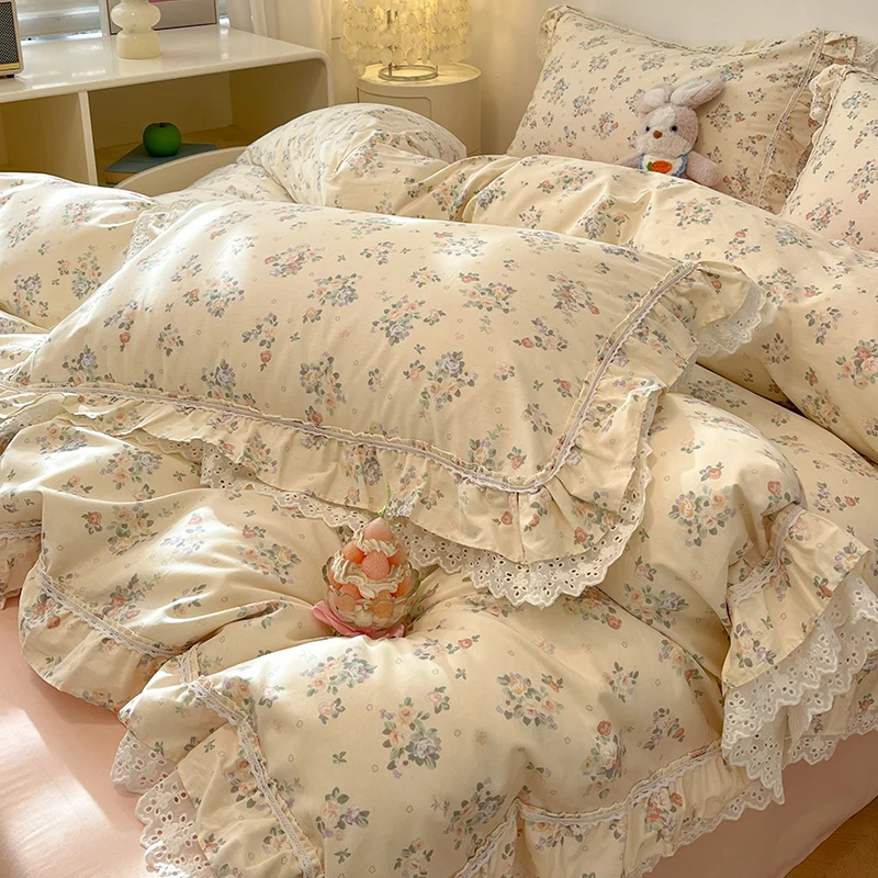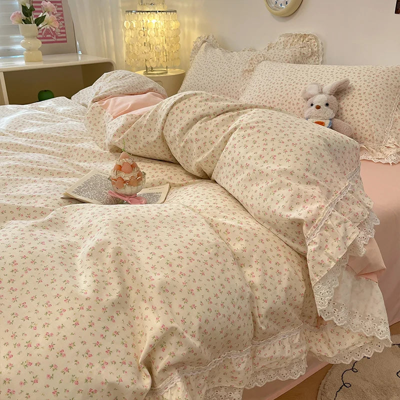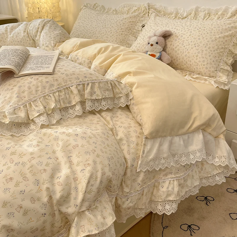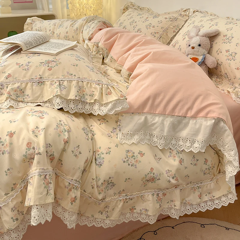Korean Princess Style Flowers Lace Ruffles 100% Cotton Bedding Set Duvet Cover Bed Sheet/Fitted Sheet/Bed Skirt Pillowcases 4Pcs